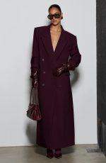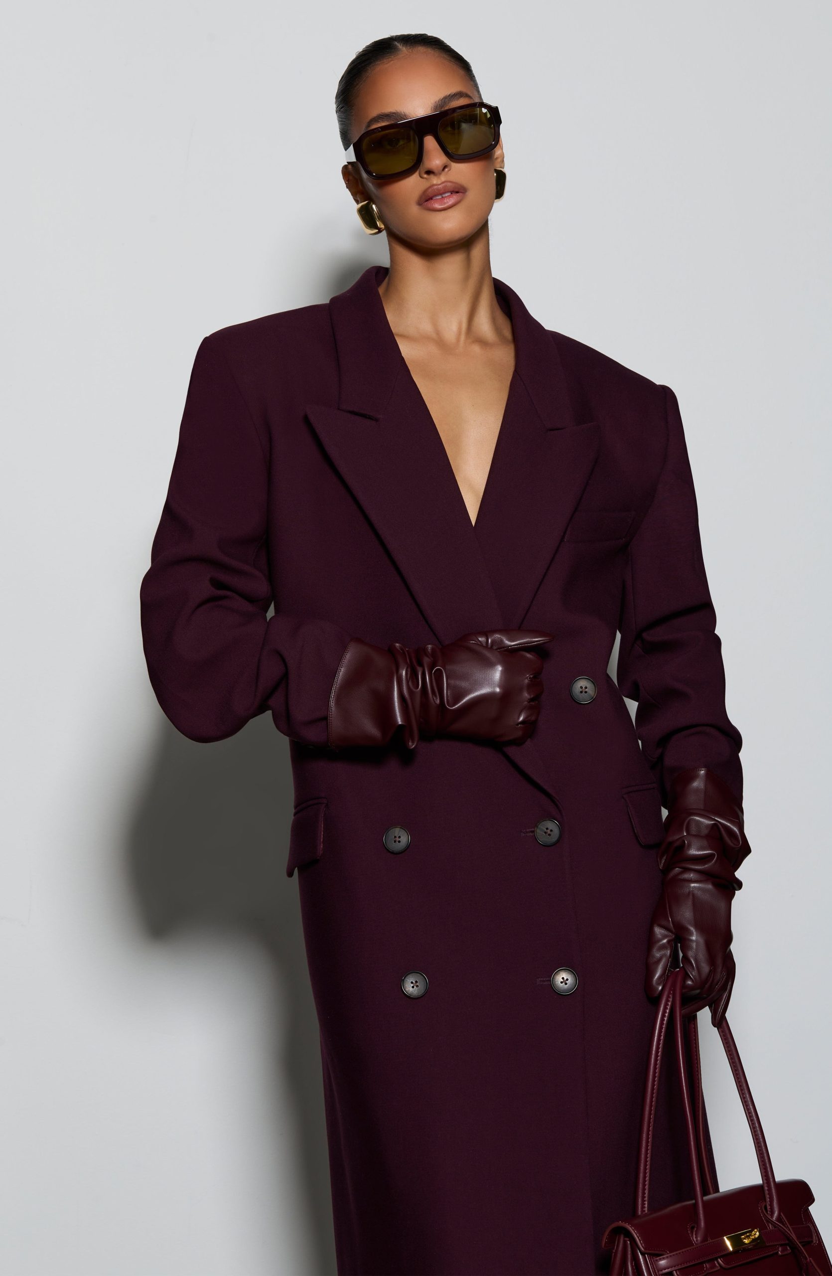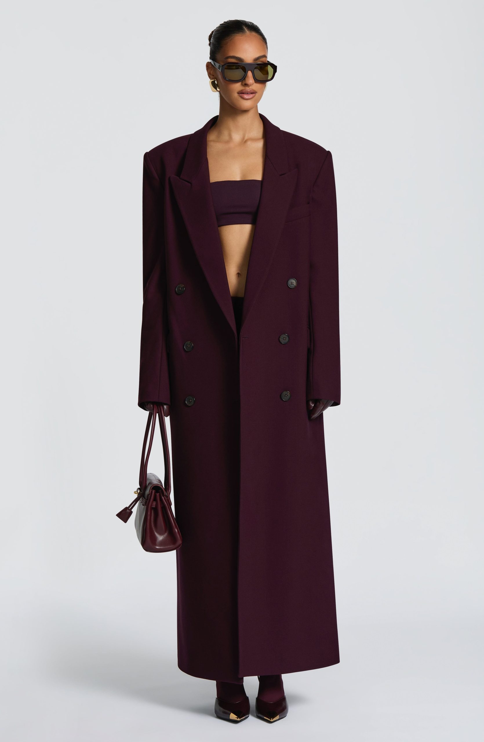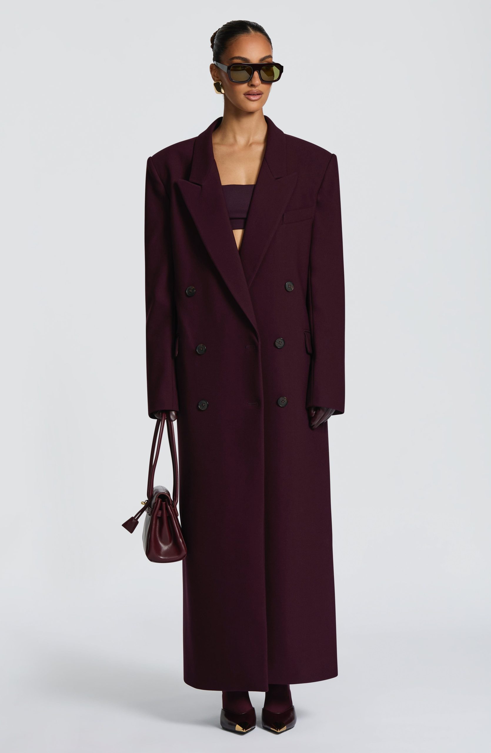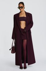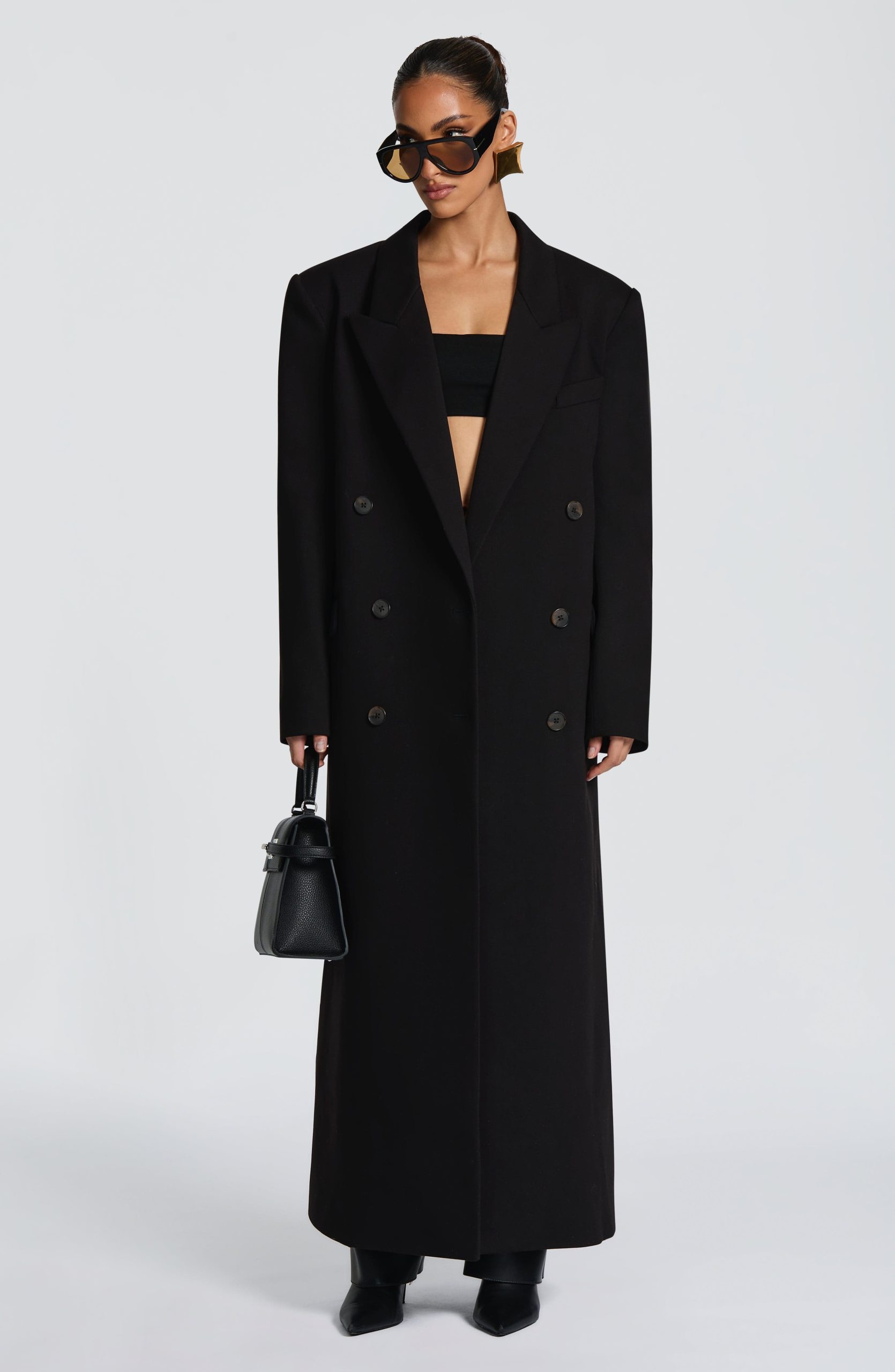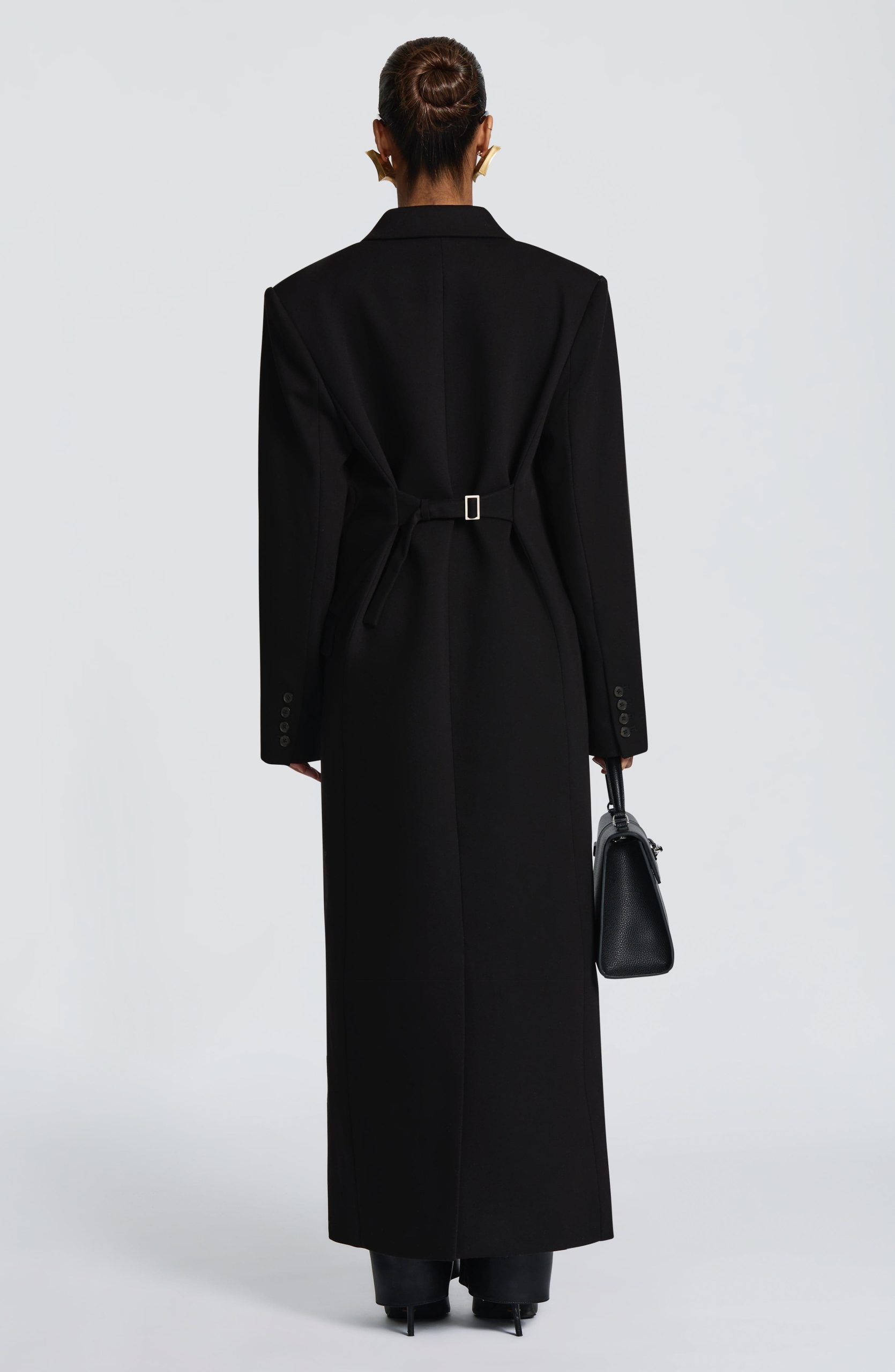 The Michelle Coat in black features a structured boxy fit crafted from non-stretch woven suiting fabric. Designed full length with a double-breasted front, peaked lapel collar, and adjustable waist strap. Practical details include double welt pockets with flaps and a centre back vent for ease of movement.