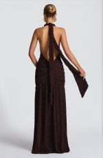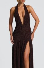 The Minerva Maxi Dress in plum brown features a textured cut-and-sew fabric with a deep plunging neckline and elegant halterneck straps tied at the back. Its low V-shaped back and ruched hips enhance the silhouette, while the thigh-high split and full gathered skirt add graceful movement.