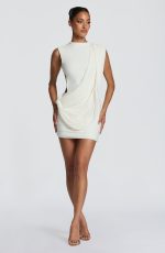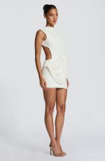The Mireya Mini Dress is crafted from soft drape mesh lined in jersey for comfort and movement, it features a refined high neck, a diagonal sash detail across the bodice, and an asymmetric open back for subtle drama. The tightly ruched mini skirt completes this sophisticated silhouette.
