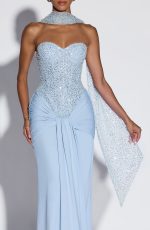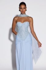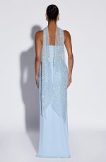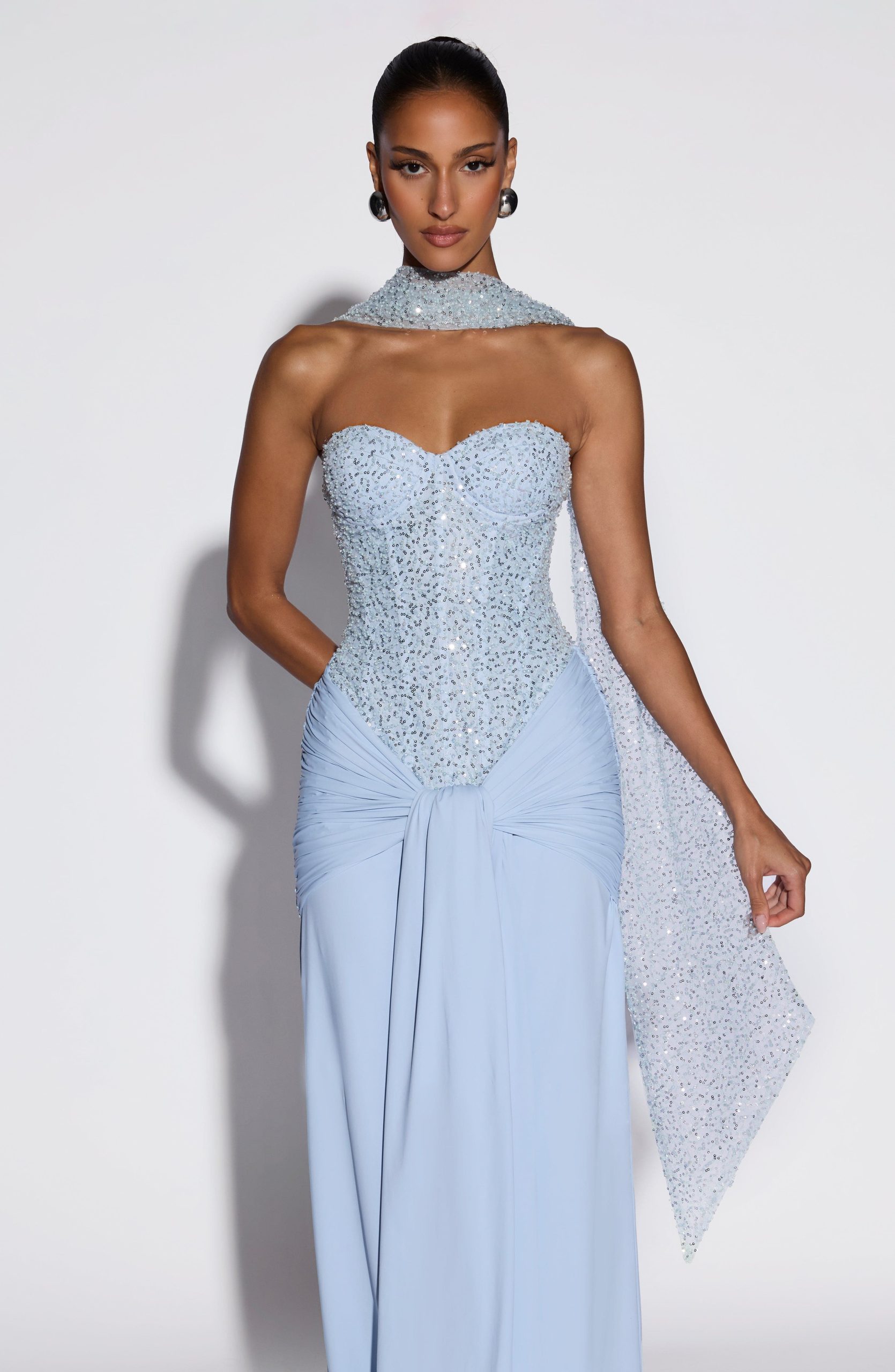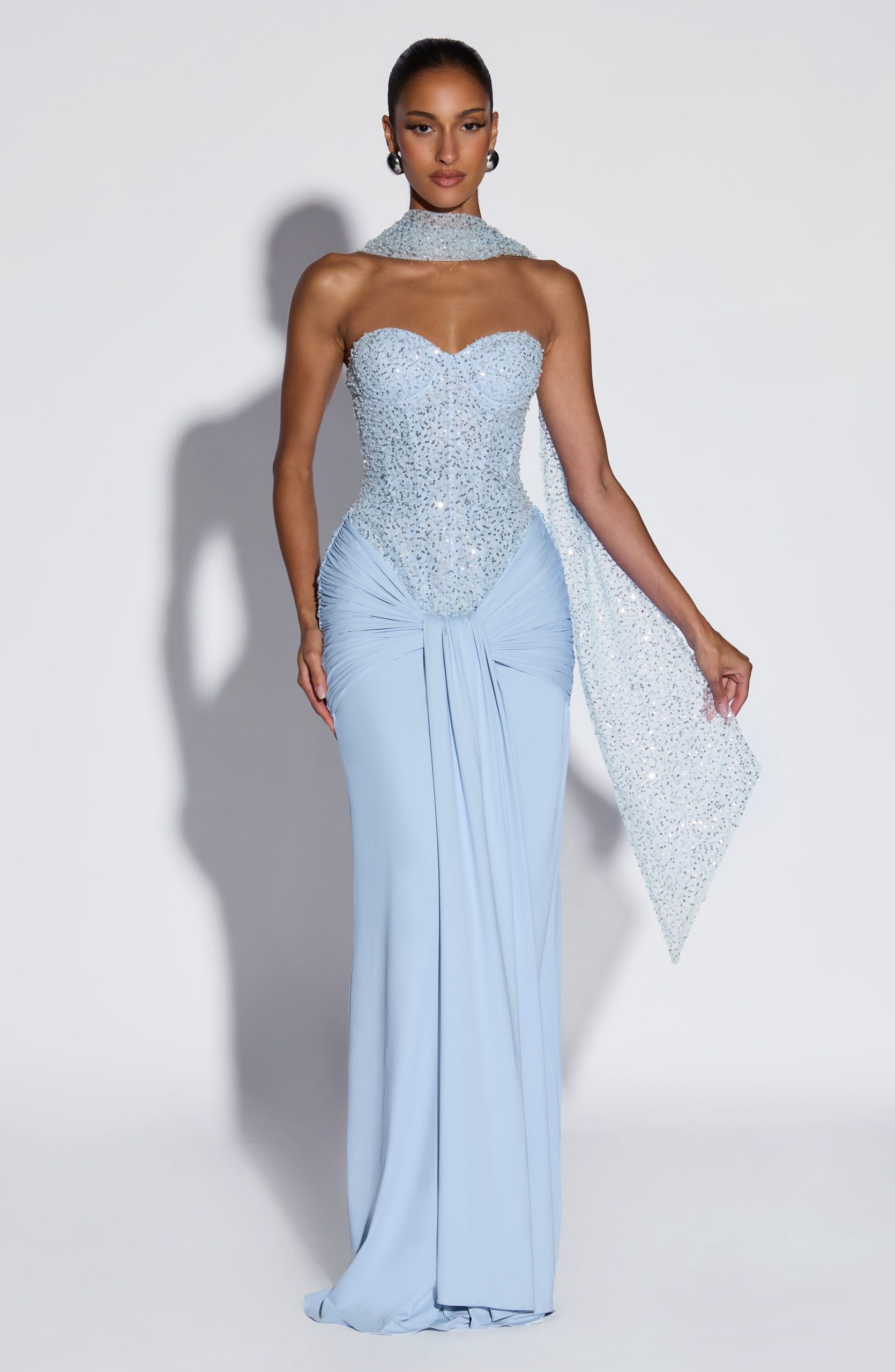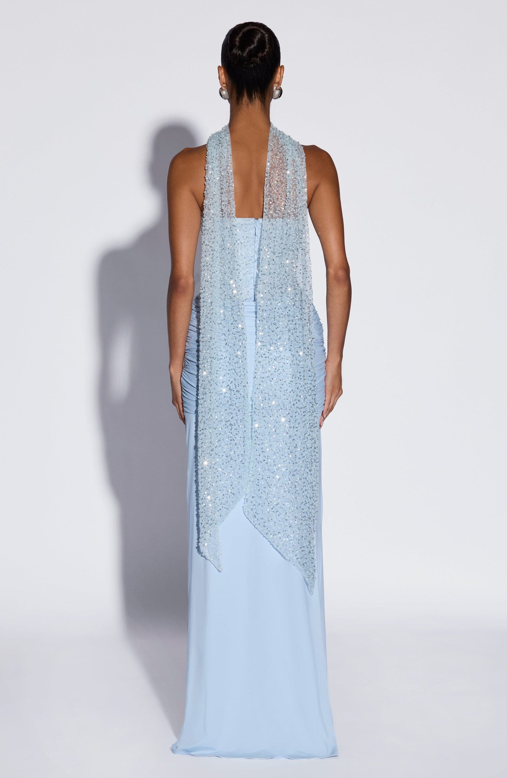 Miya Scarf in Glacier Blue features delicate embellished tulle that catches the light beautifully. Drape it elegantly over your neck for an instant touch of sophistication and texture to any outfit.