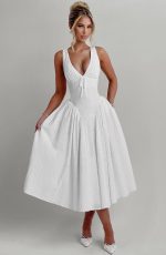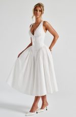 Steal the spotlight with the romantic Monroe Midi Dress in Ivory, a delightful look for garden parties, date nights, and more. Designed with custom cotton broderie anglaise fabric featuring dainty flowers and bows, this dress embodies playful elegance. The plunge neckline and gathered cups are accented by a charming decorative tie at the front, while the lace-up back ensures a perfectly cinched fit. The full skirt, detailed with godet panels and delicate gathering at the hips, creates a flattering and feminine silhouette.