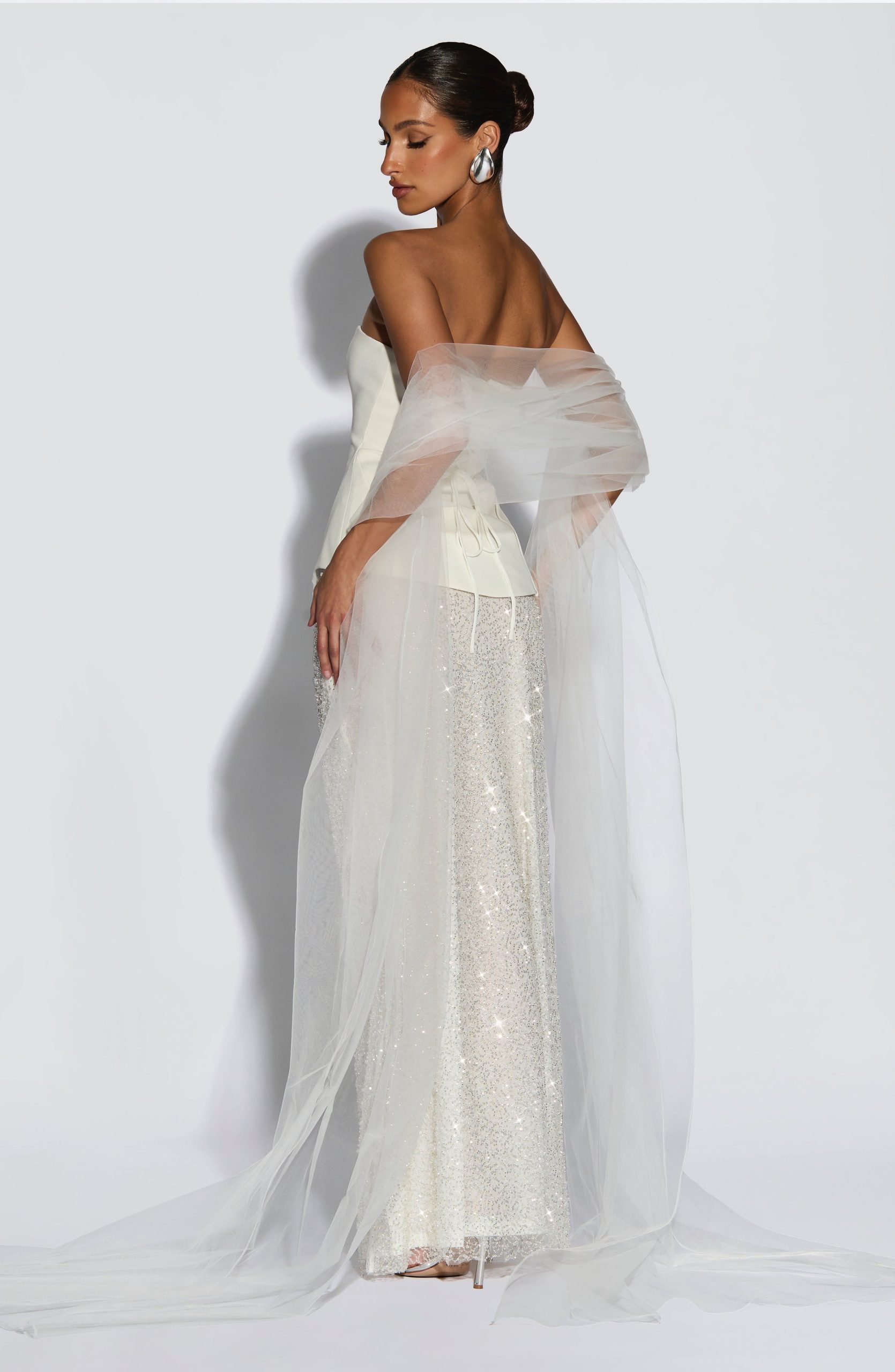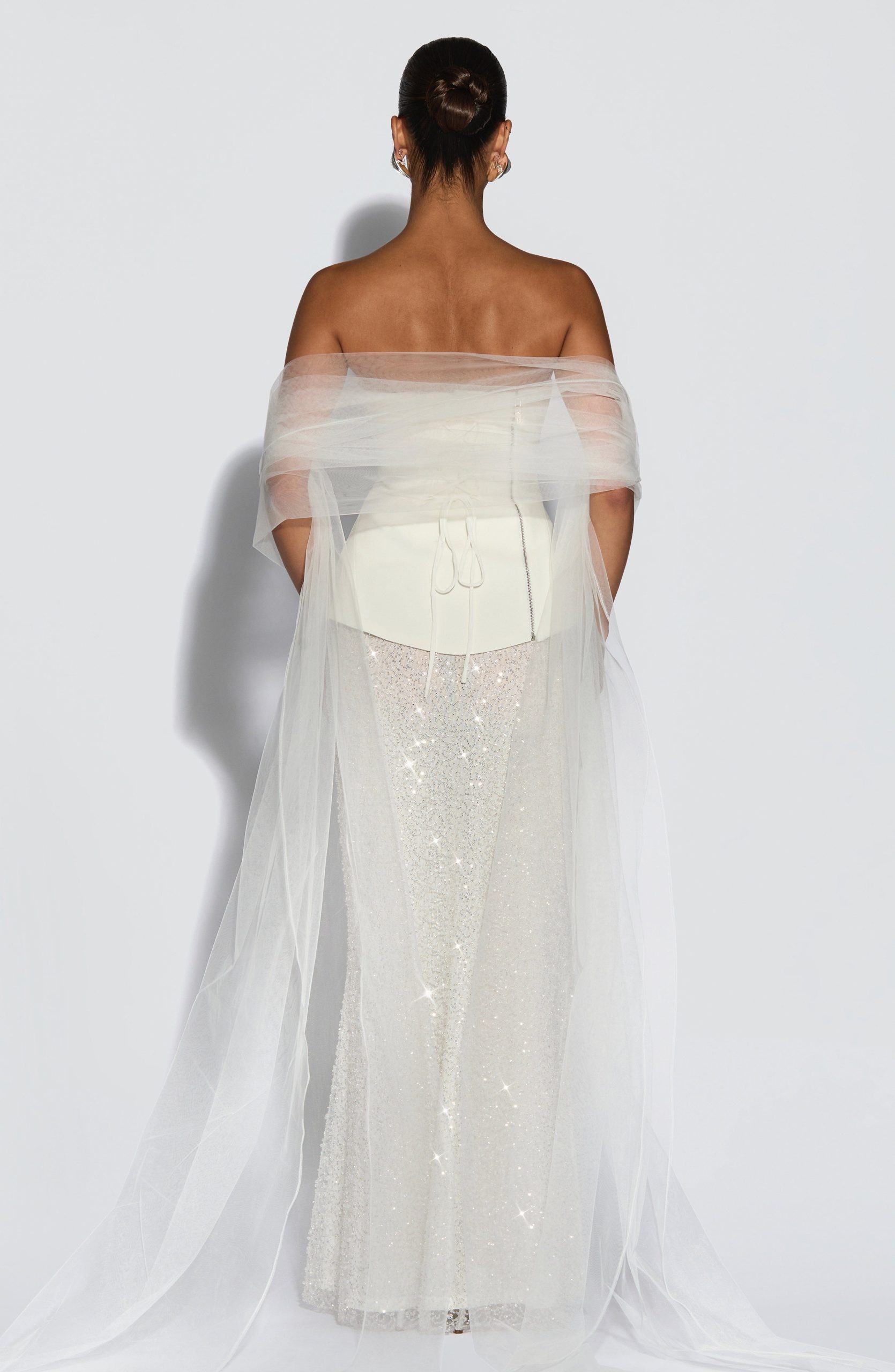 The Myrtle Shawl in Ivory is crafted from sheer, lightweight tulle, offering an extra-long length and moderate width for graceful volume. Designed to drape elegantly over the arms or around the neck, it provides a refined and sophisticated accessory to elevate any outfit.