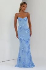 An elegant maxi gown in icy Glacier Blue, the Nefertiti features stretch mesh with floral ribbon appliqué, underwired cups, and internal corset boning for a sculpted silhouette. The fit-and-flare skirt, spaghetti straps, and open lace-up back create a striking look.