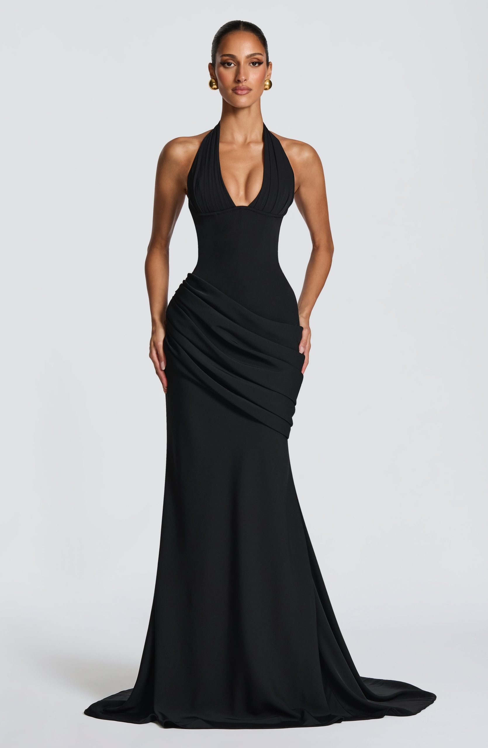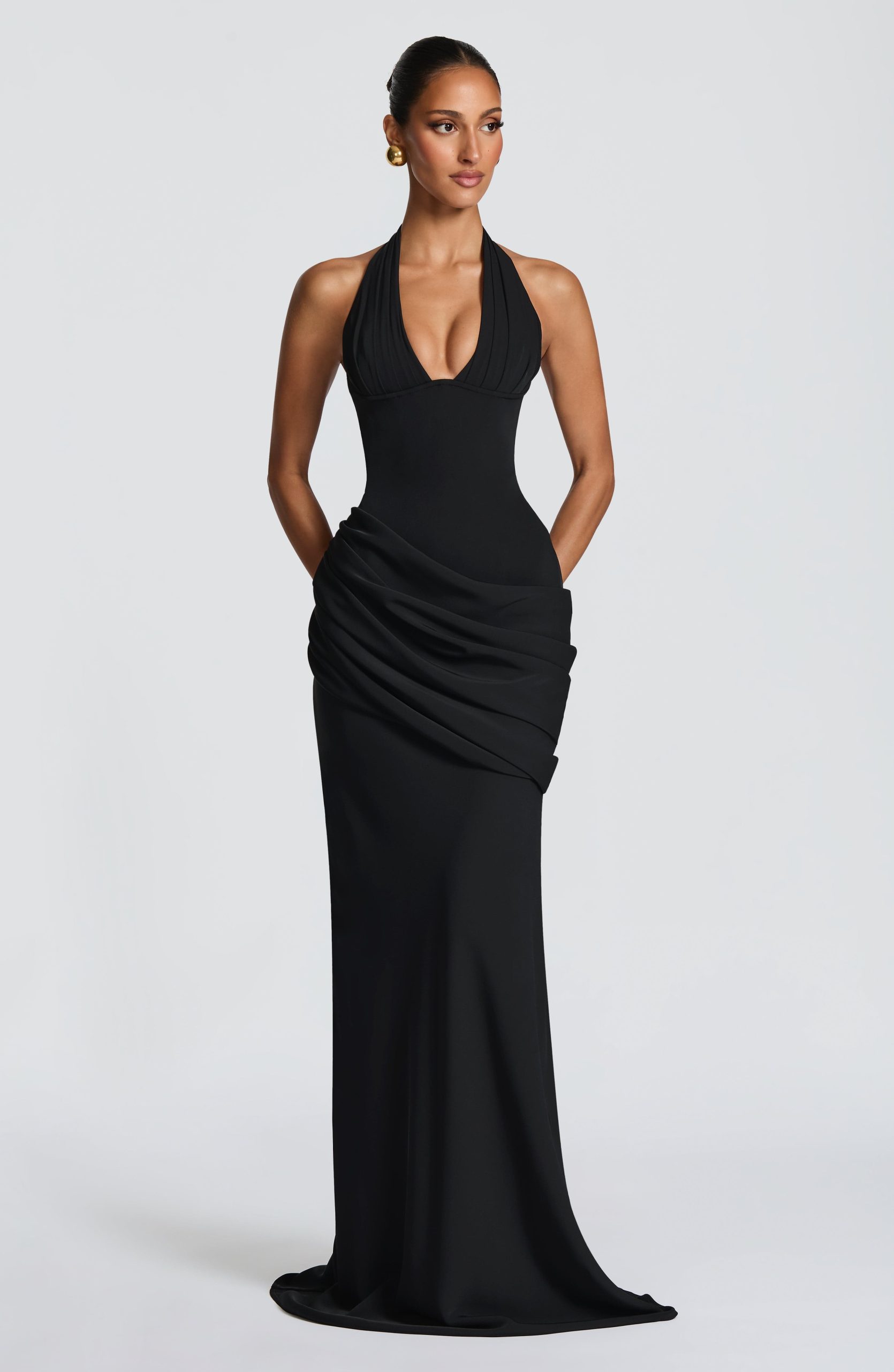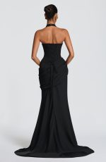 Nehemia Gown in black crepe features a plunge halter neckline with pleating and supportive underwire cups. The corseted bodice showcases a lace-up back, while an asymmetric pleated panel drapes across the hips. A subtly flared skirt with dramatic train and bustle detail completes this piece.