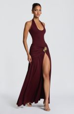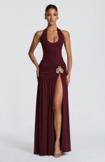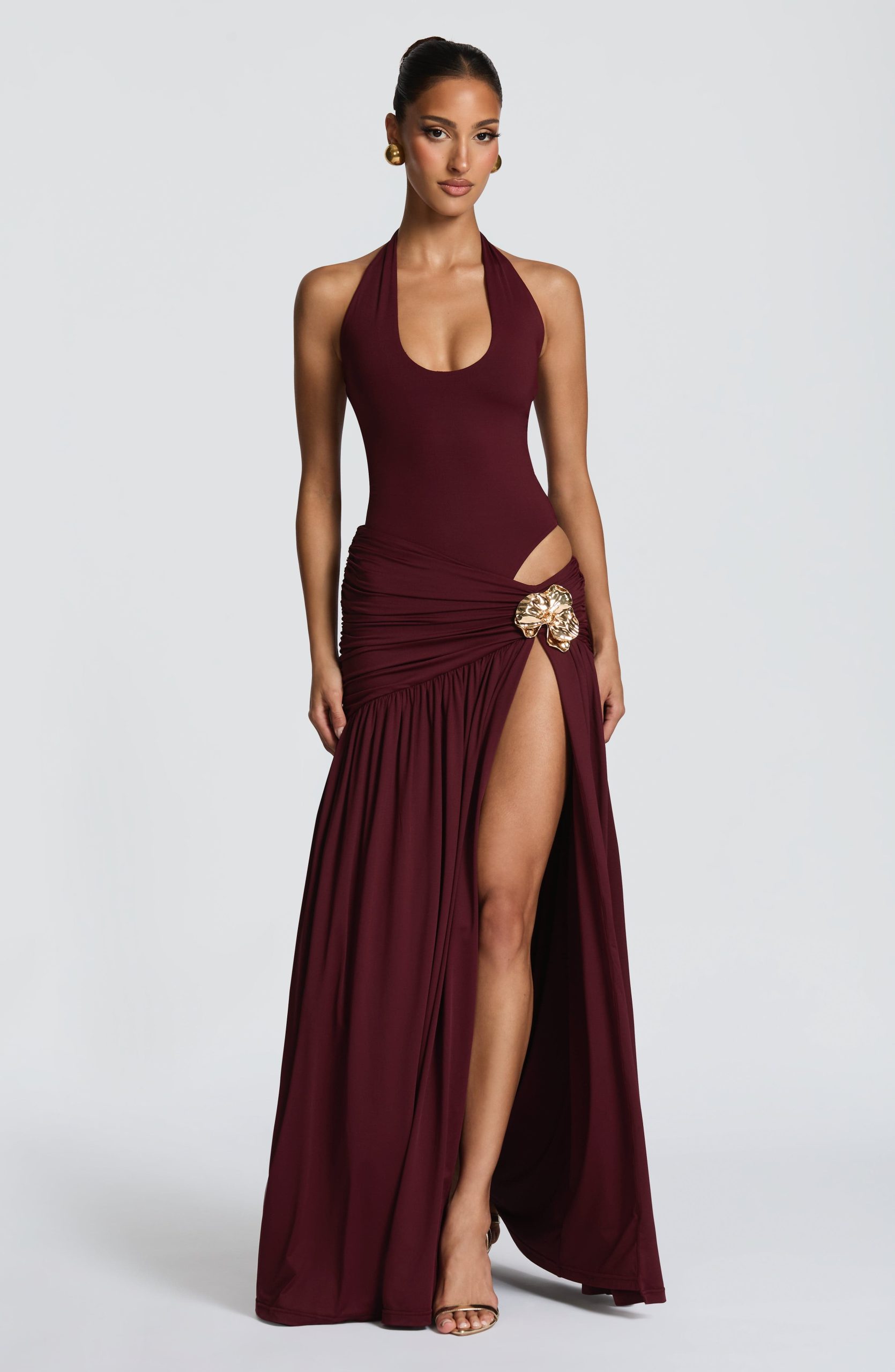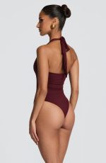 The Odelle Bodysuit in Cherry Lacquer combines luxe slinky jersey with a striking low U-shaped plunging neckline and adjustable halter straps that tie at the back of the neck. A sophisticated, form-fitting essential that transitions effortlessly from day to evening.