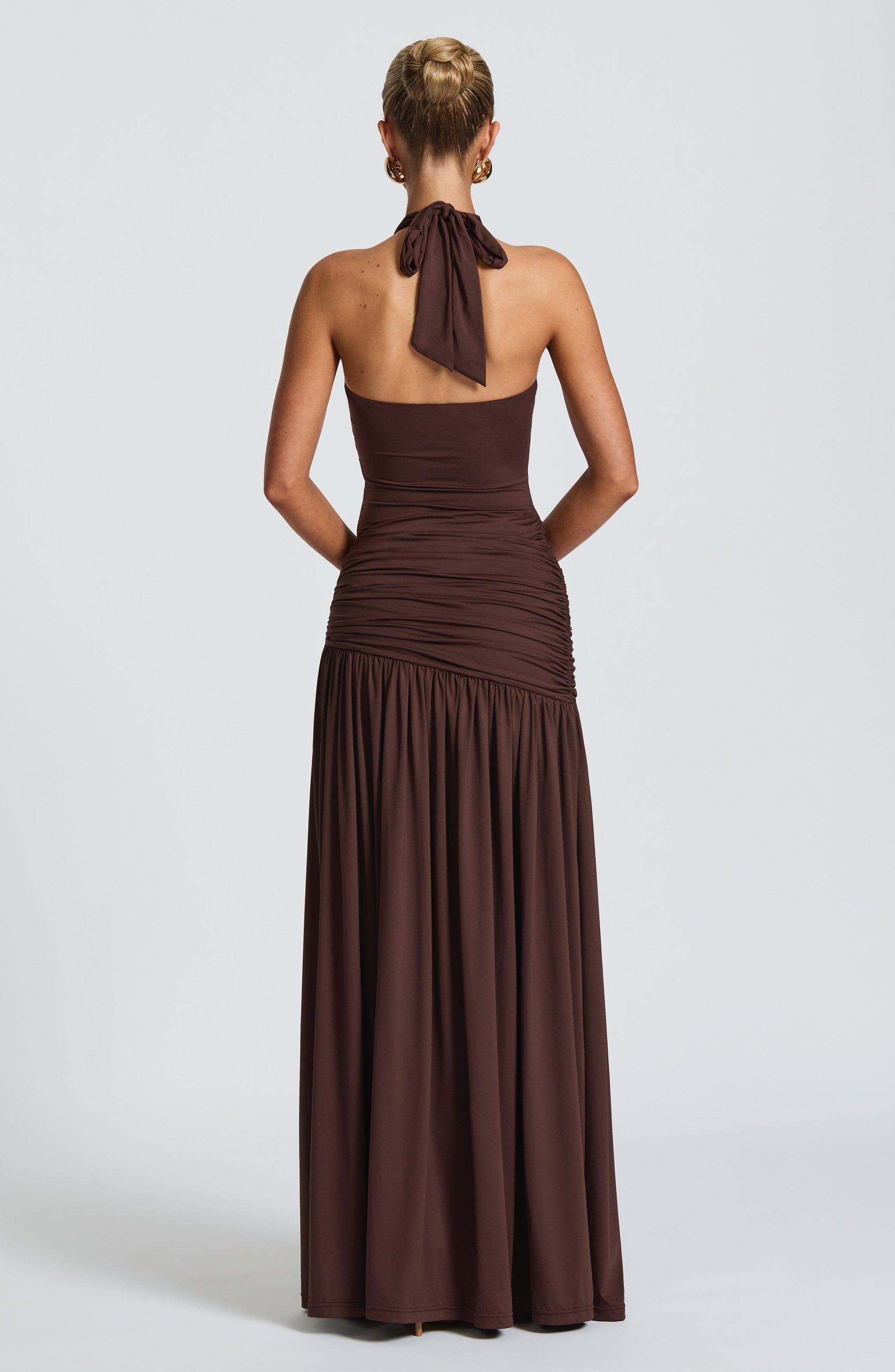 Embrace refined elegance with the Odele Bodysuit in rich Plum Brown. Crafted from luxurious slinky jersey that drapes beautifully against your skin, this sophisticated piece features a dramatic U-shaped plunging neckline complemented by elegant halter straps that tie at the nape. Style with the Saira Maxi Skirt.