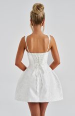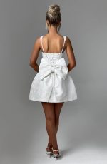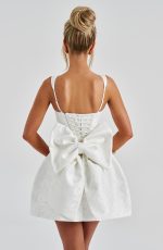 Be the belle of the ball in our Orla Mini Dress! The ivory color and premium non-stretch floral jacquard fabric make it a standout choice. With a square neckline, adjustable straps, and waist cinching, it flatters your figure. Plus, the detachable oversized bow adds an extra touch of whimsy. Tulip skirt, lace-up back, and invisible zipper complete the look.