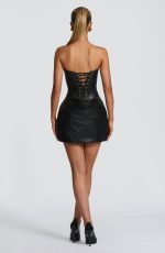 The Palmer Mini Dress in black features soft faux leather and a structured bodice with boning for a flattering fit. Its scooped neckline with a pleated cowl and cowled overlay skirt with deep side pleats create elegant movement. The dropped waist adds a modern, sophisticated touch.