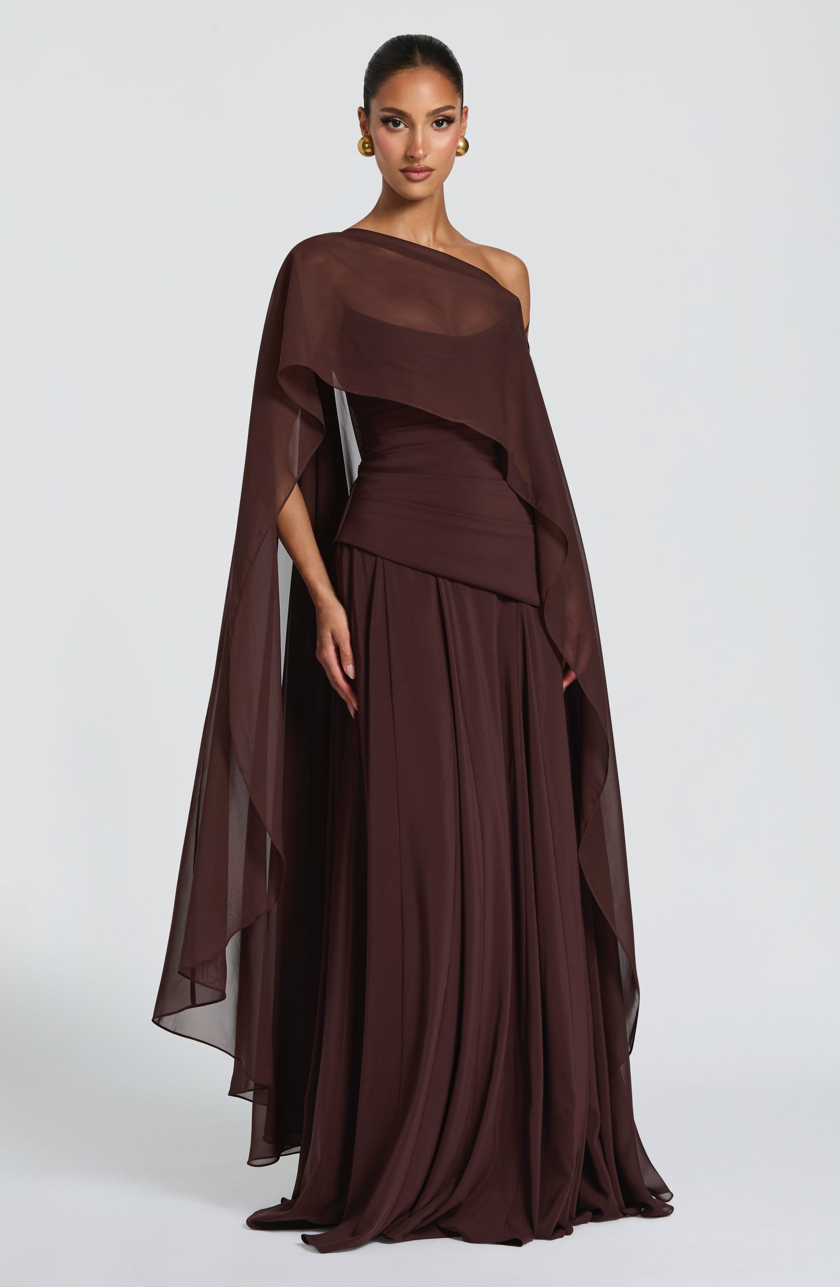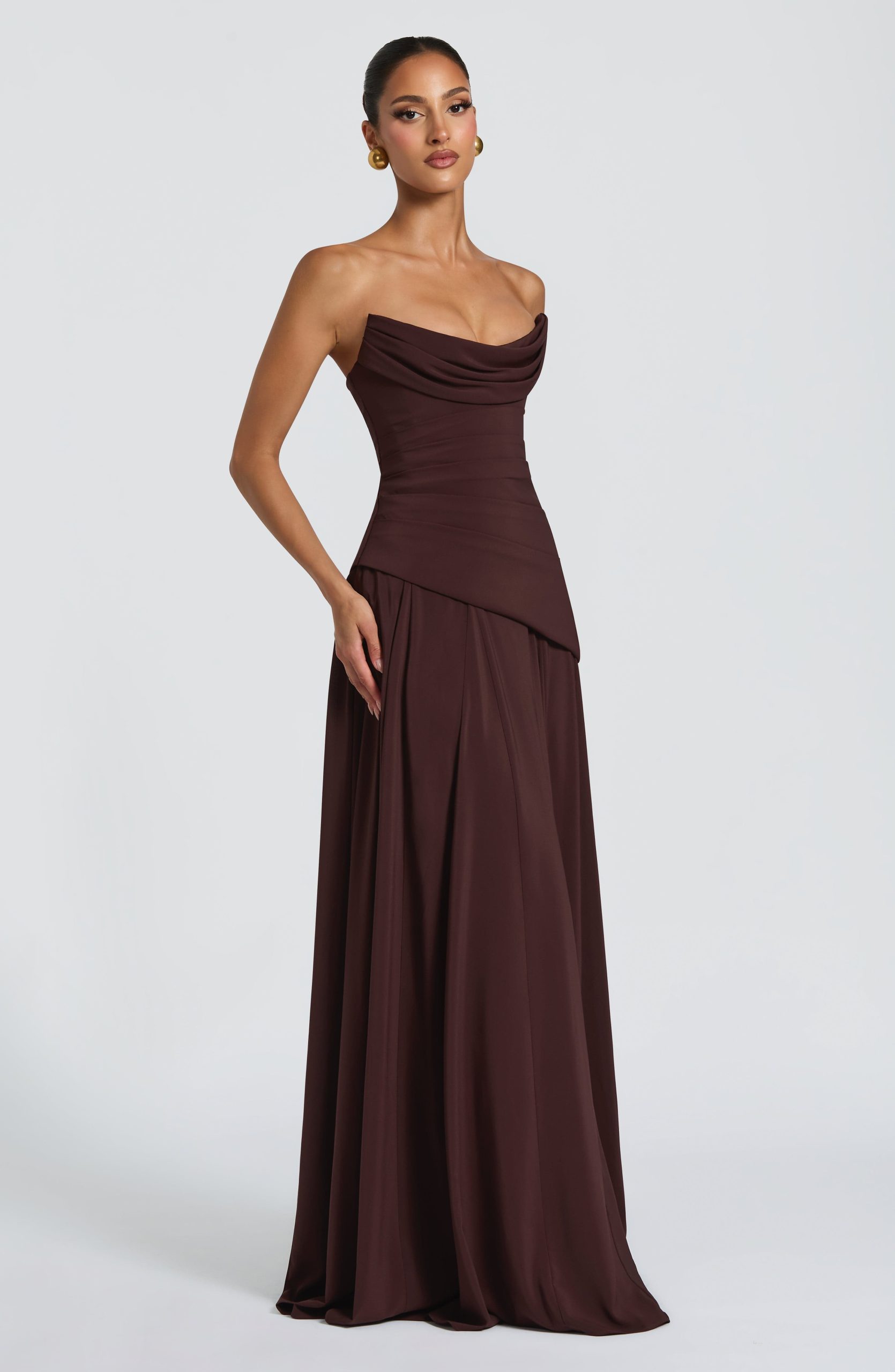 The Patricia Maxi Dress in Plum Brown is crafted from lightweight chiffon, this piece features a scooped neckline with pleated cowl, a structured bodice with asymmetric hemline, and a voluminous skirt enhanced by multiple godets. The lace-up back adds refined movement and dimension throughout.