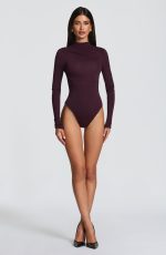 The Pearson Bodysuit in plum features a refined bodycon fit crafted from soft modal jersey. Its long sleeves and high neck elevate sophistication, while asymmetric pleating across the chest and waist adds subtle texture. A keyhole with button closure at the back neck completes this elegant piece.