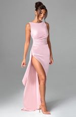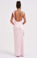 More-is-more with the Peggy maxi, a flirty dress made in sleek, body-hugging satin with stretch. With a high, wide neckline and low scoop back, this maxi has a draped thigh high split and removable corsage to the shoulder with frill detailing. Wear yours with loose waves and metallic heels.
