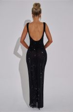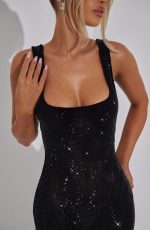 Indulge in luxury with the Petra Maxi Dress in Black. Made from premium stretch net adorned with hotfix rhinestones, its semi-sheer appearance and fully lined mesh provide an elegant touch. The square neckline and low scoop back add sophistication, while the invisible zipper and maxi length create a timeless silhouette.