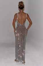 Indulge in luxury with the Petra Maxi Dress in Black. Made from premium stretch net adorned with hotfix rhinestones, its semi-sheer appearance and fully lined mesh provide an elegant touch. The square neckline and low scoop back add sophistication, while the invisible zipper and maxi length create a timeless silhouette.
