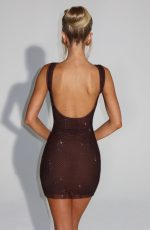 Elevate your wardrobe with the luxurious Petra Mini Dress in rich Plum Brown. The mini length and stretch net fabric with square hotfix rhinestones create a sensual silhouette, while the semi-sheer mesh lining adds a touch of sophistication. The square neckline and low scoop back exude elegance, making this bodycon dress a must-have for any exclusive occasion.