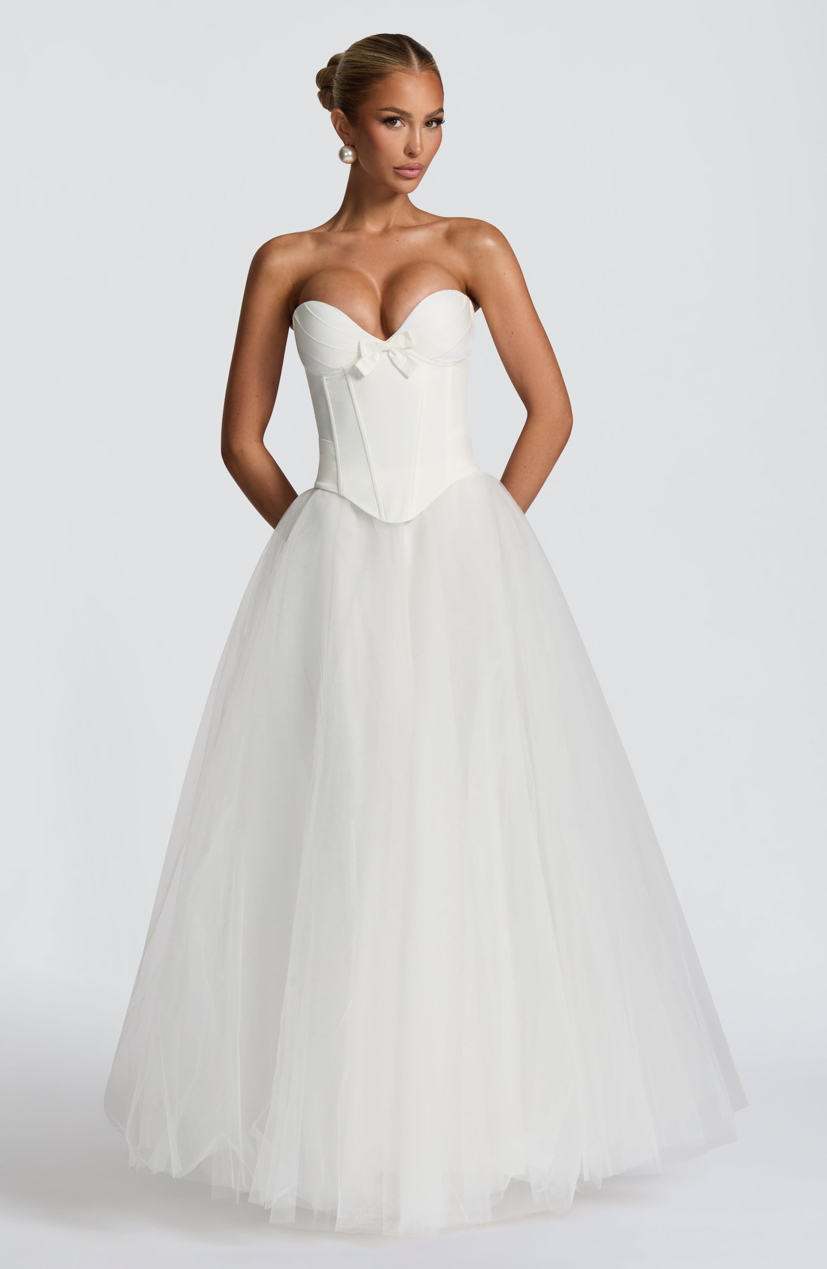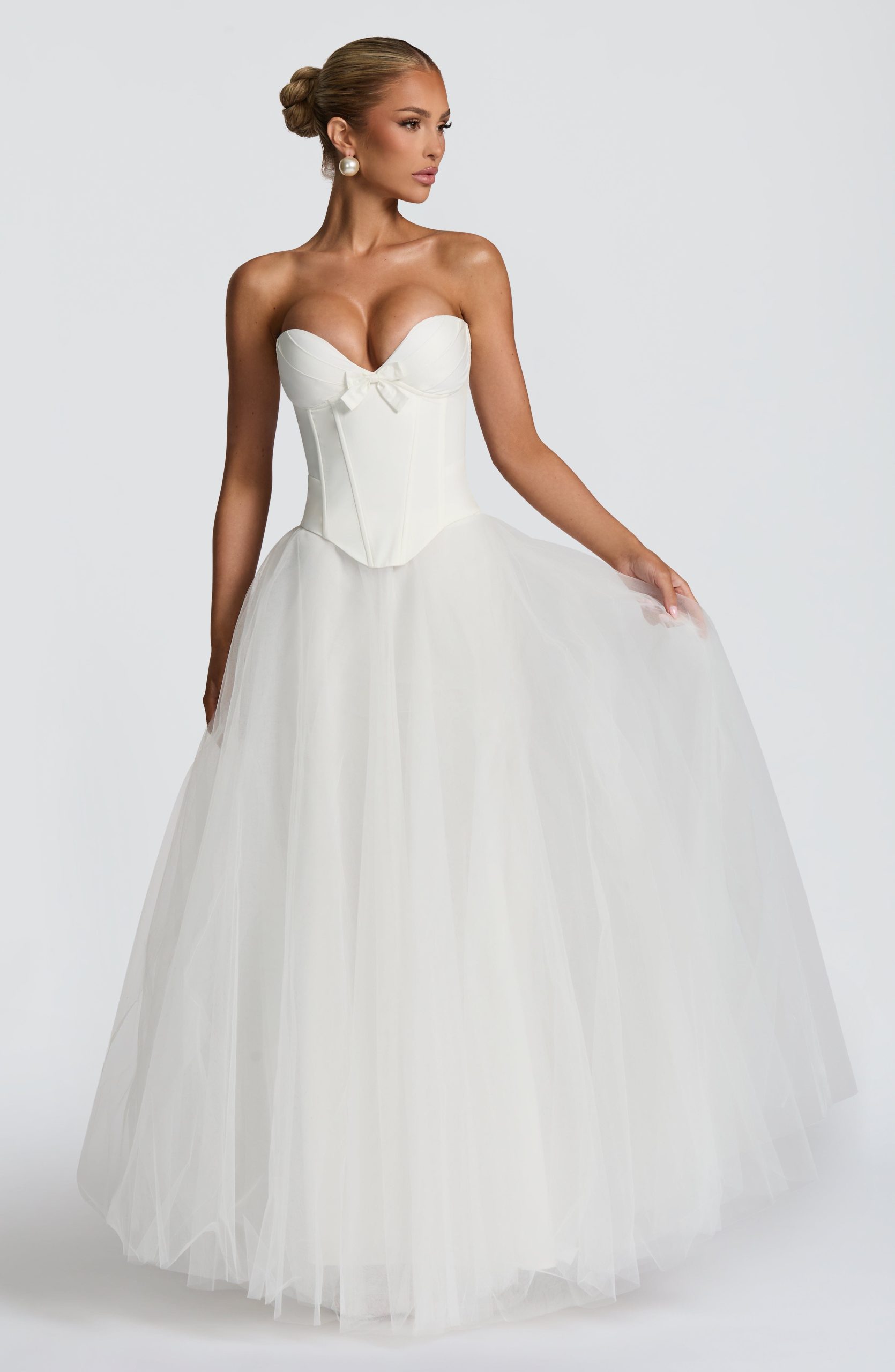 The Prim Corset in Ivory features a strapless sweetheart neckline, lightly padded cups with monowire, pleated detail, and a decorative bow. Boning and a lace-up back with shirring provide a refined, customizable fit.