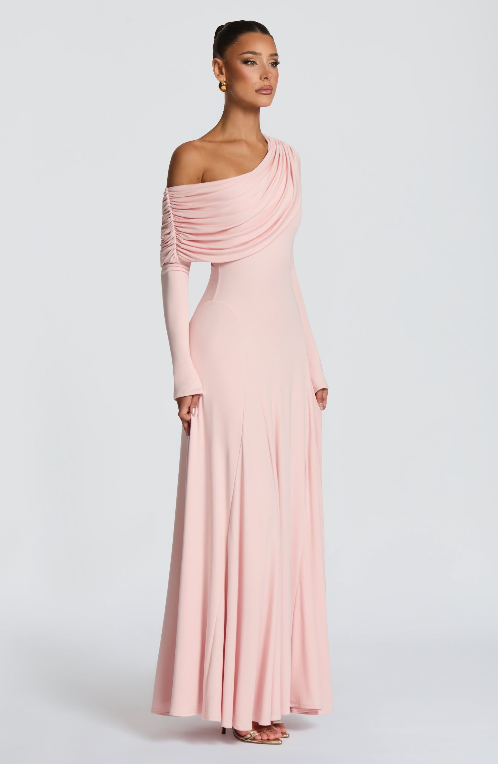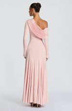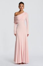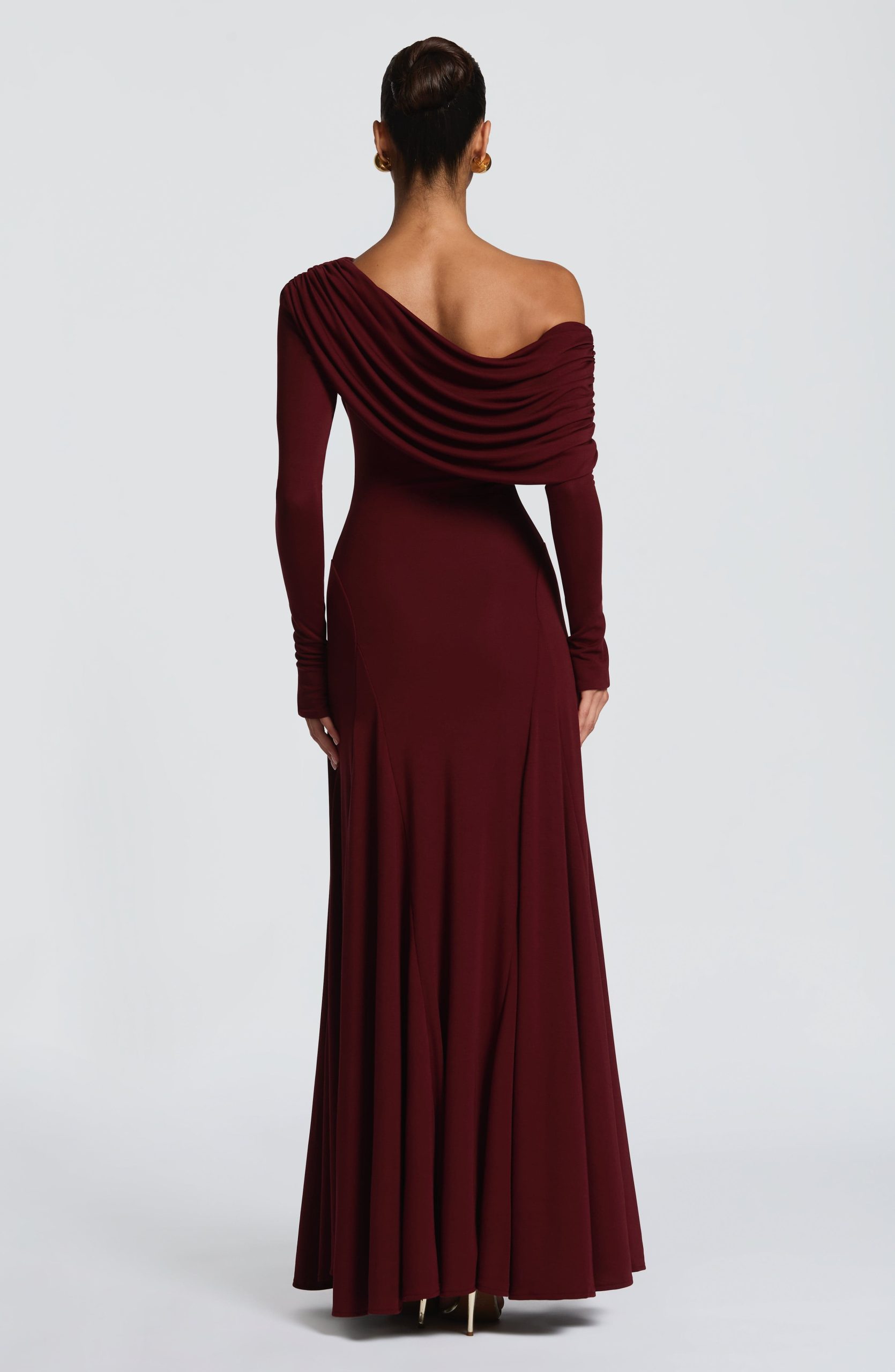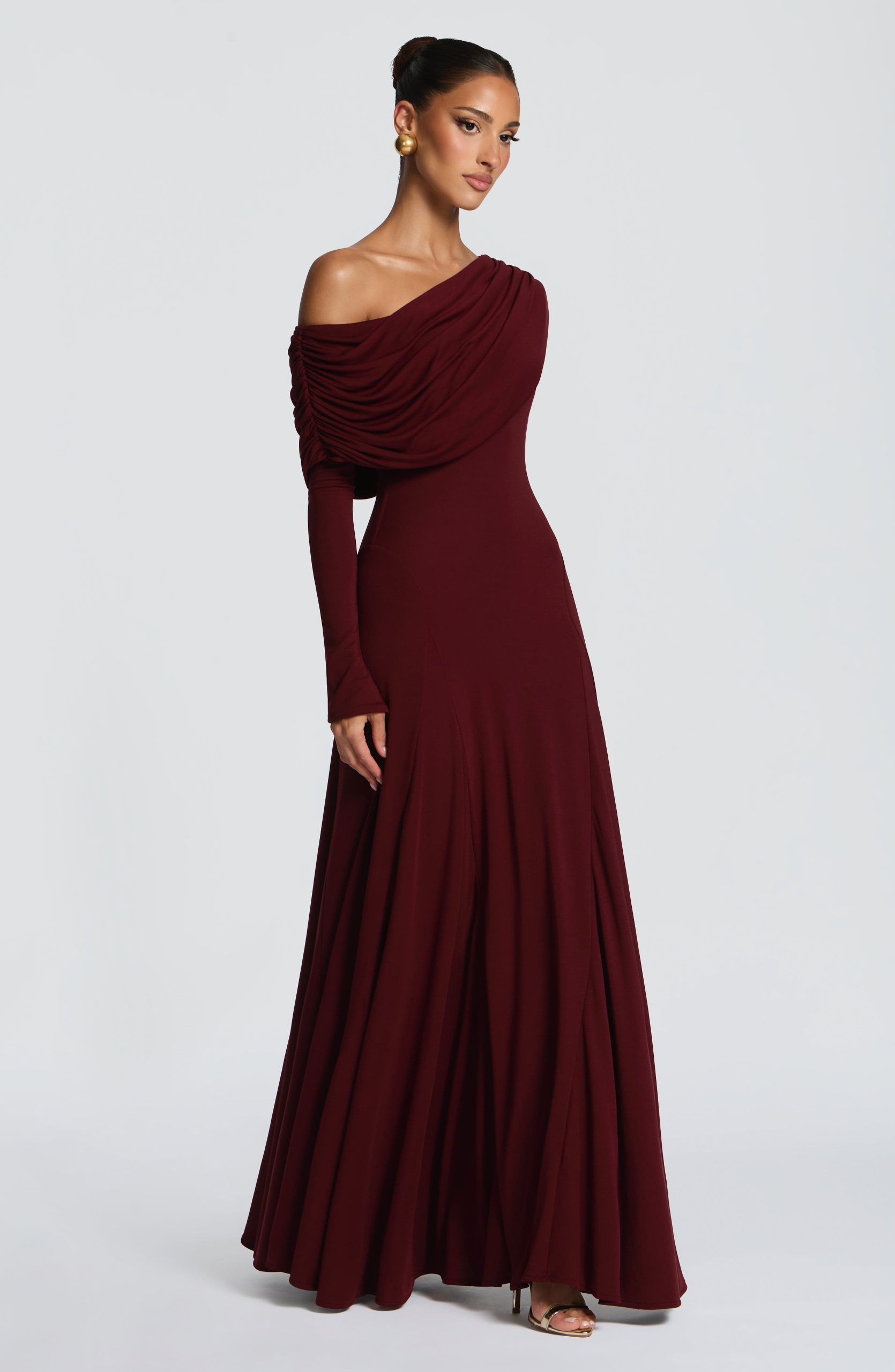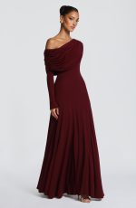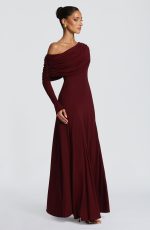 The Rafaela Maxi Dress in Cherry Lacquer is crafted from soft modal jersey, this piece features an asymmetric off-shoulder neckline with a gathered panel that drapes across the neck. A fitted bodice flows into a flared maxi skirt, enhanced by shaped godet panels at the hips for refined silhouette. Long sleeves complete the look.