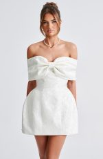 A stylish but oh-so-romantic design, Raquel is a showstopper for your big day. Cut from beautiful floral jacquard fabric, it features an off-the-shoulder bardot bow neckline to flatter the decolletage. The mini dress is complete with a tulip shaped skirt and lace up back for your perfect fit. Style with flower-adorned heels and pretty waved hair.