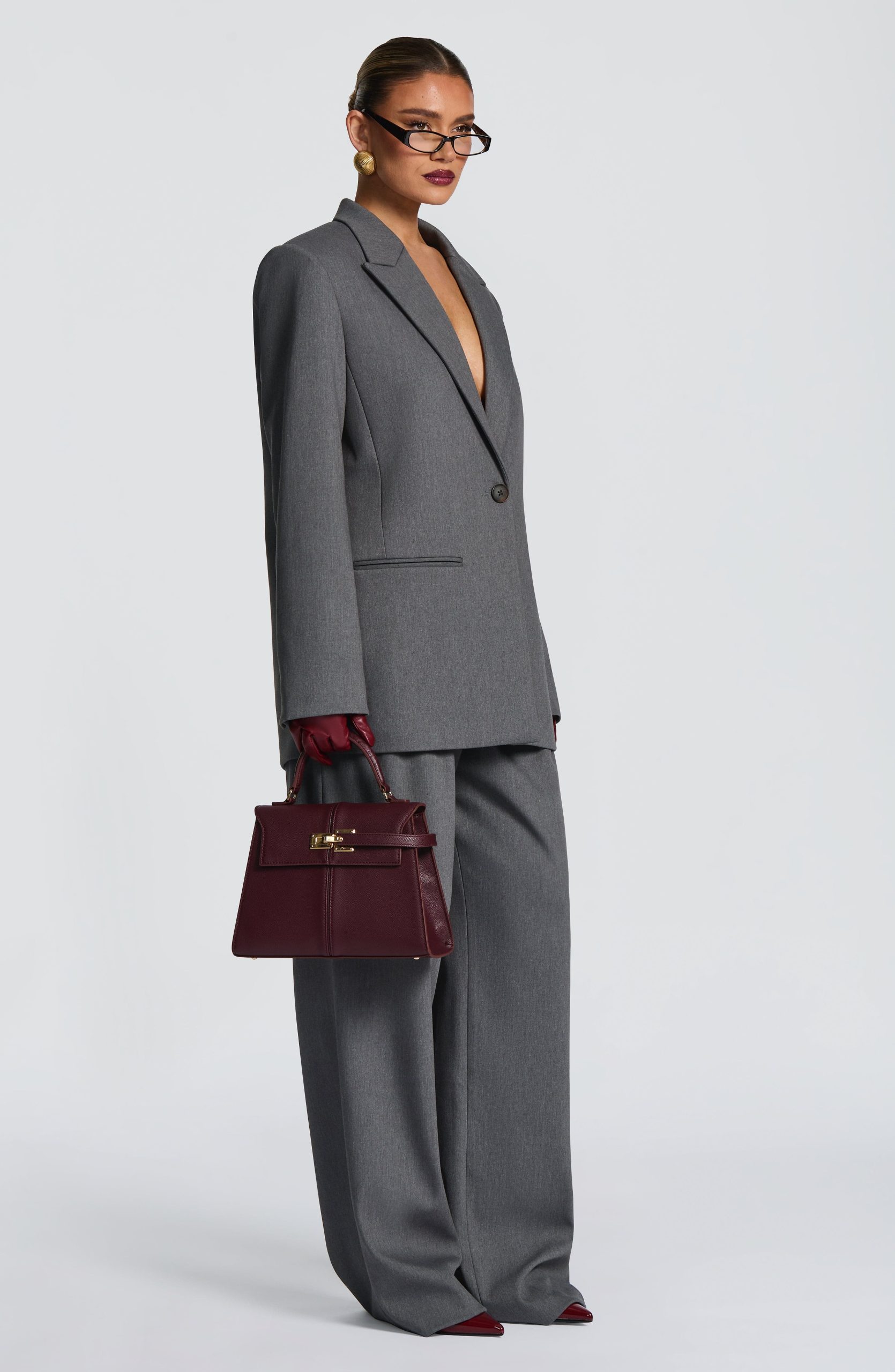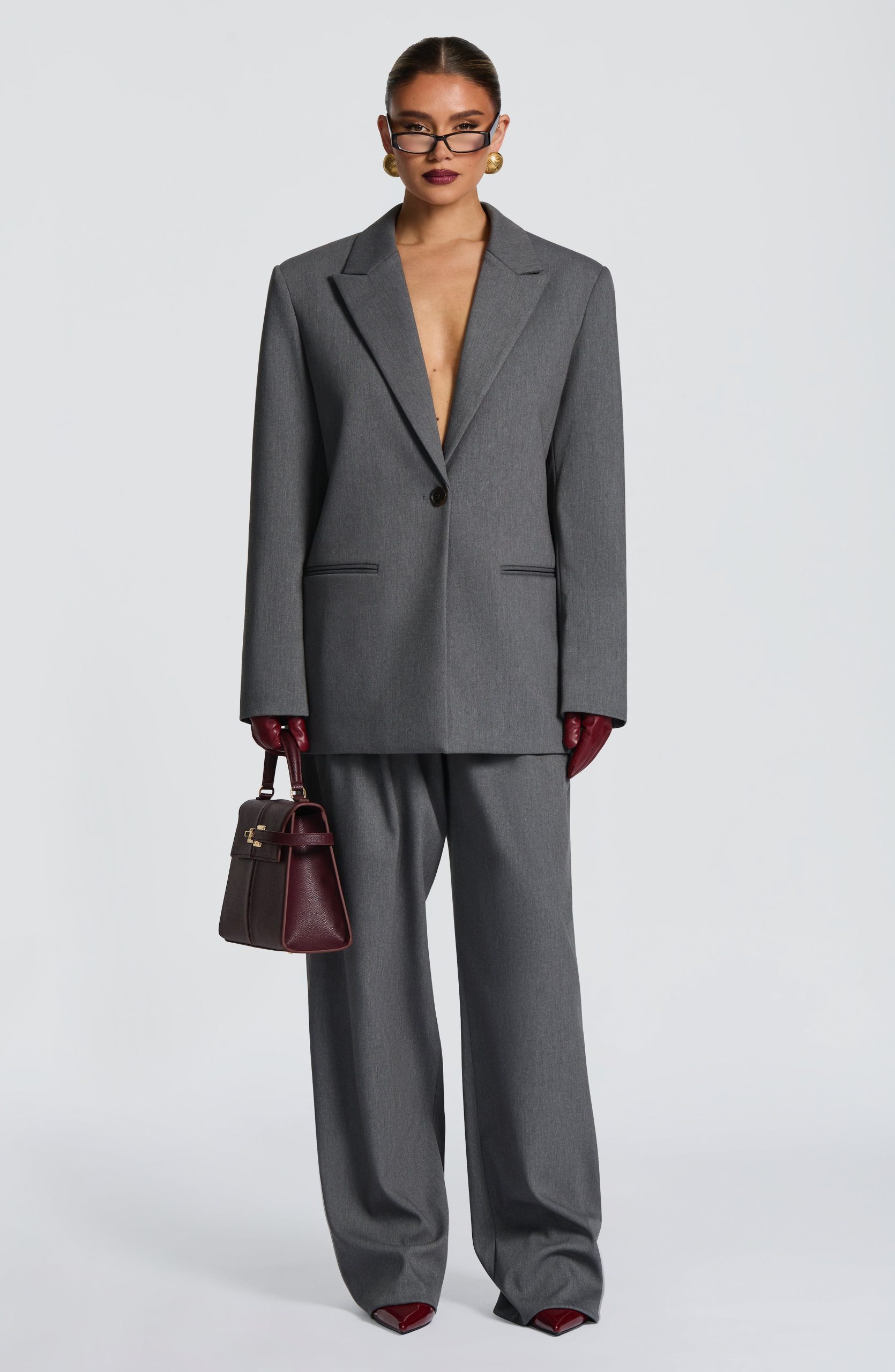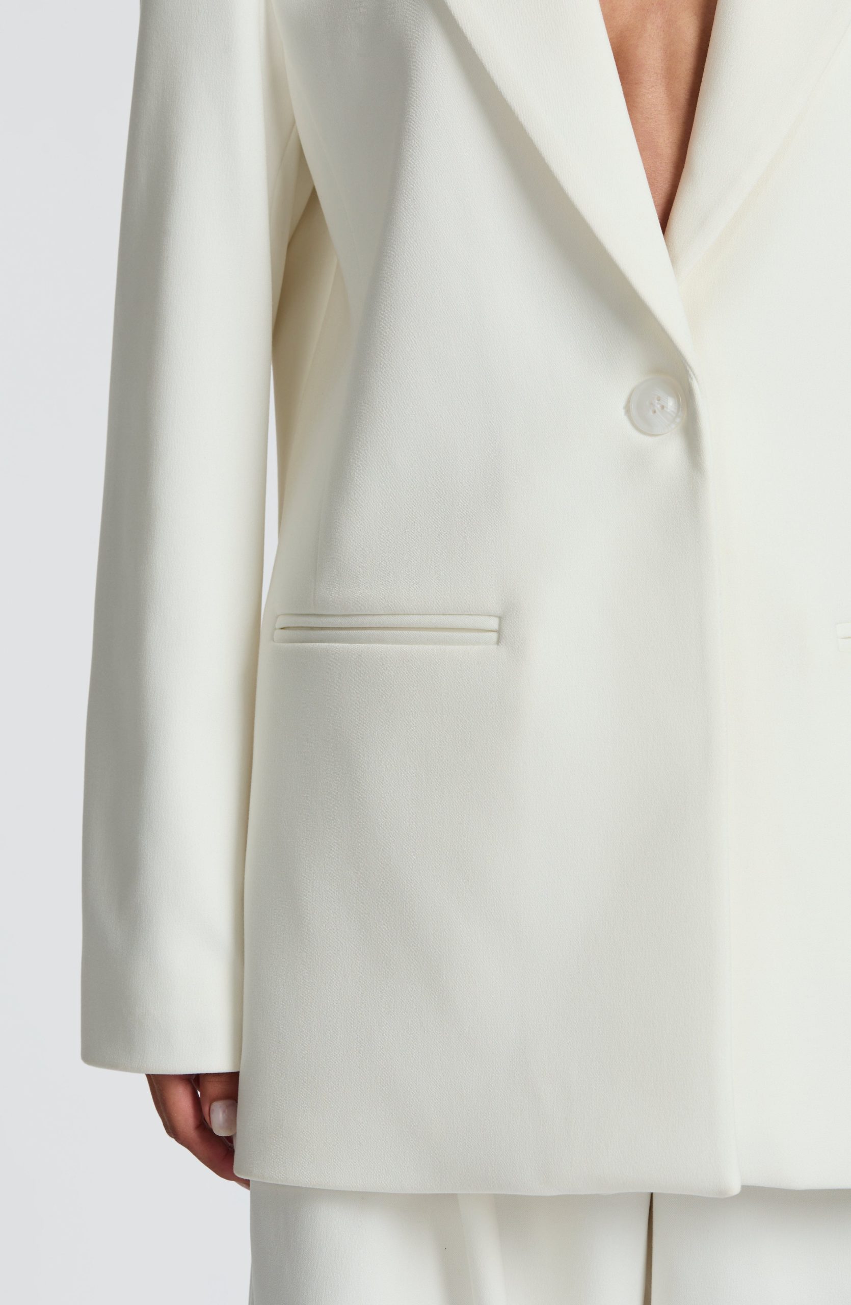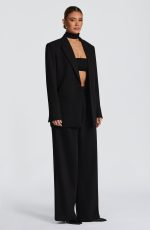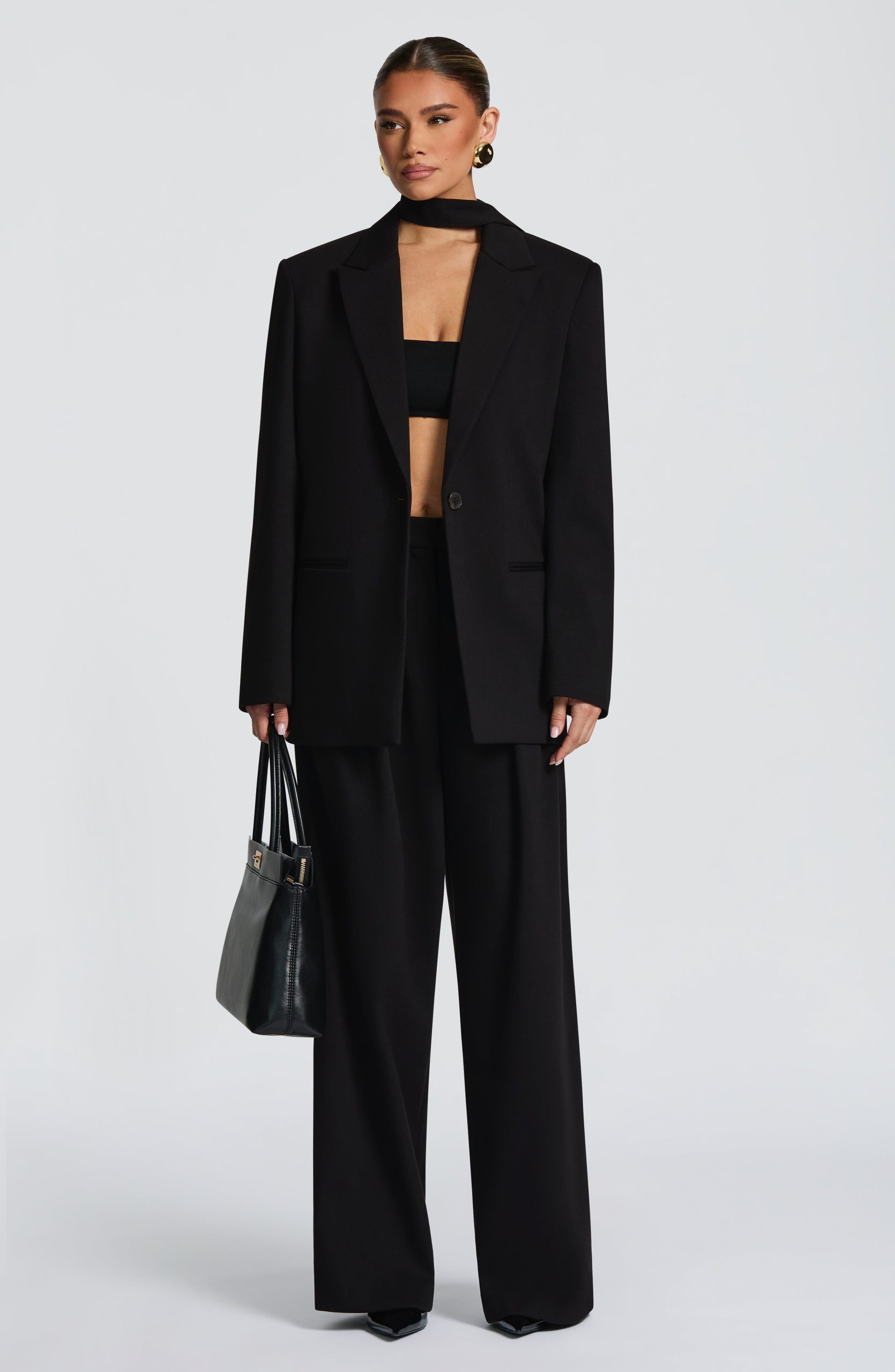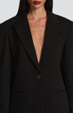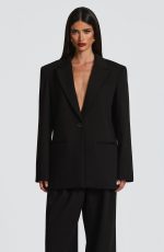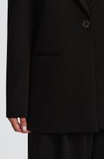 The Reece Blazer in black features a non-stretch woven suiting fabric for a structured, polished look. Its notched lapel collar and oversized, boxy silhouette create a modern, sophisticated style. Finished with a single button closure and twin double welt pockets.