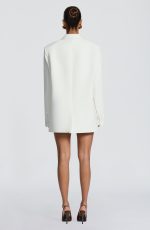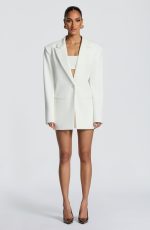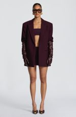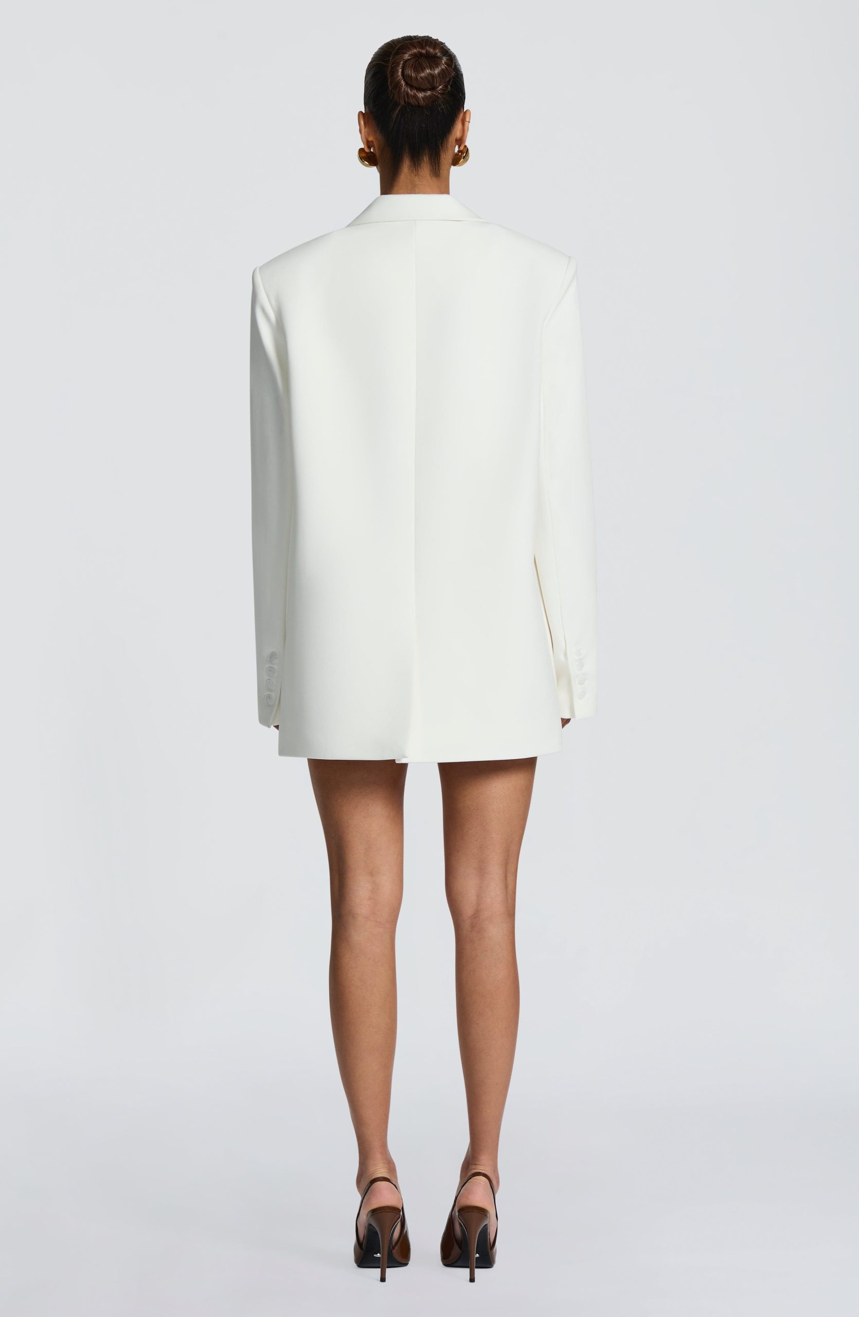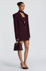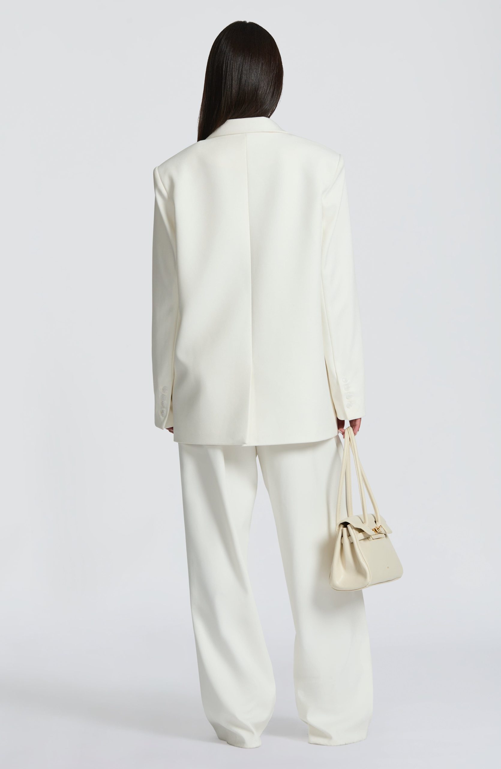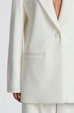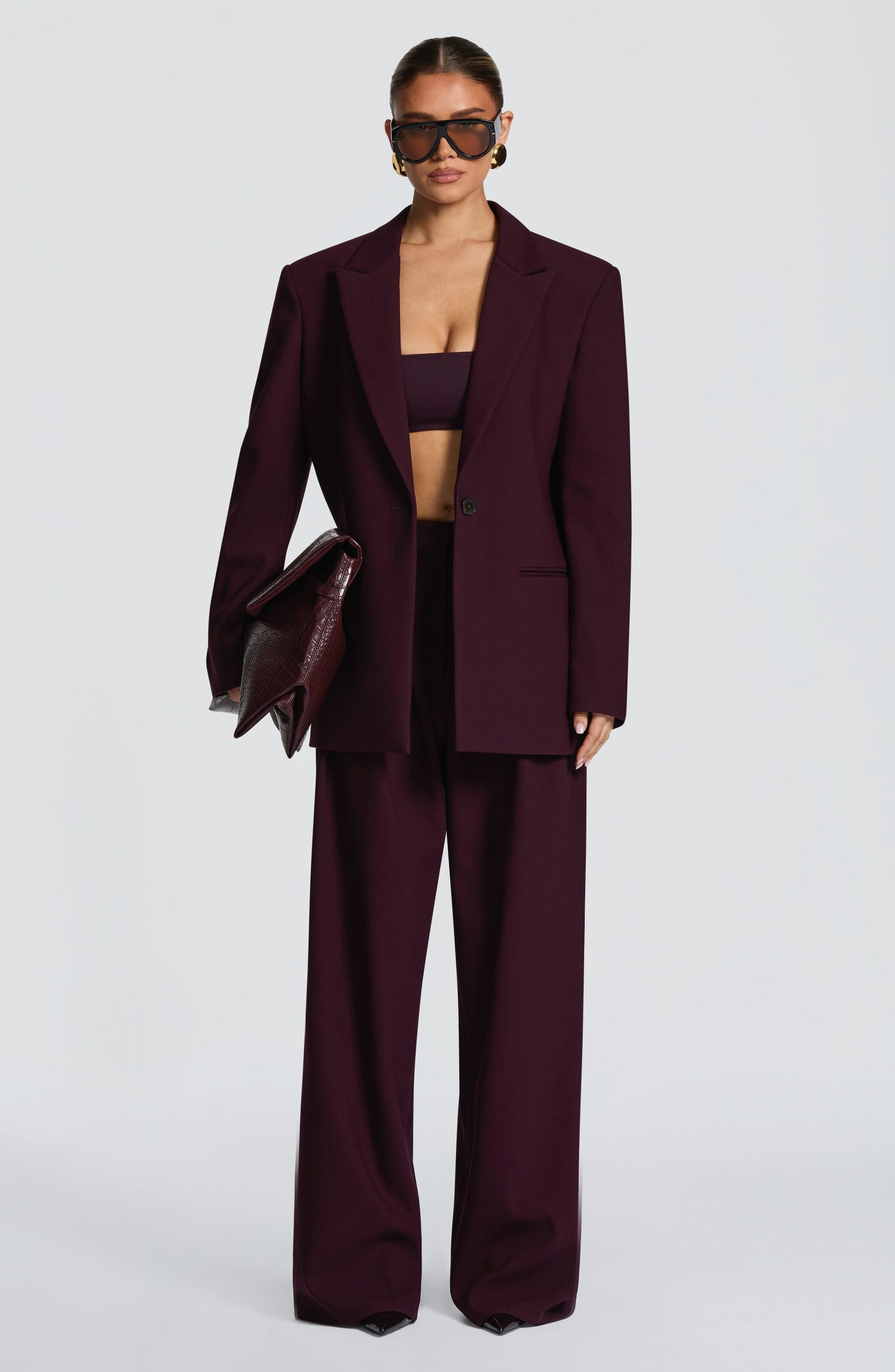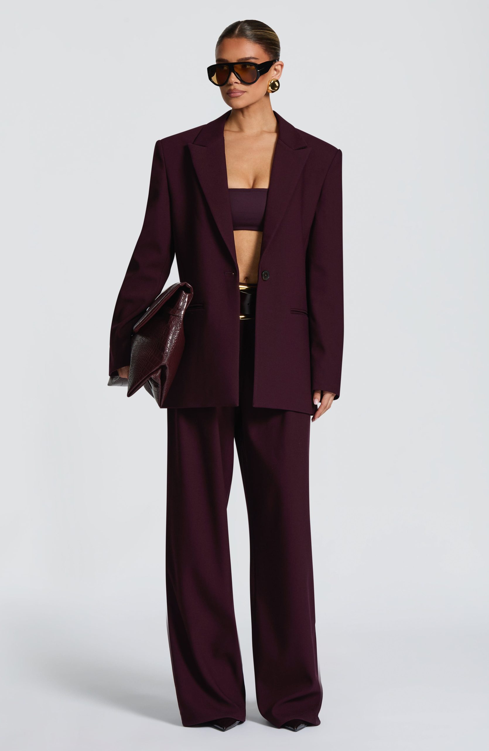 The Reece Blazer in black features a non-stretch woven suiting fabric for a structured, polished look. Its notched lapel collar and oversized, boxy silhouette create a modern, sophisticated style. Finished with a single button closure and twin double welt pockets.