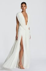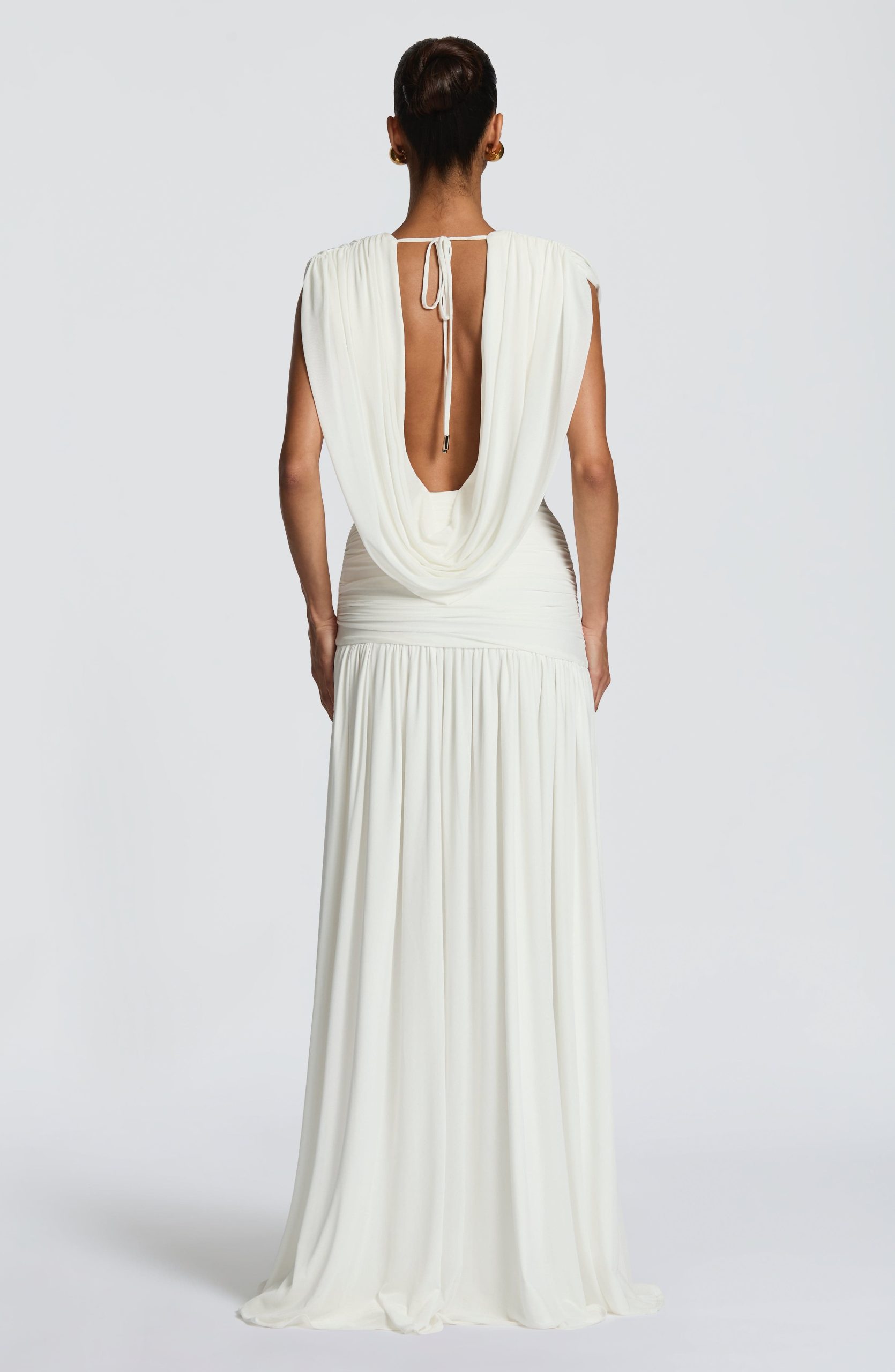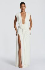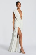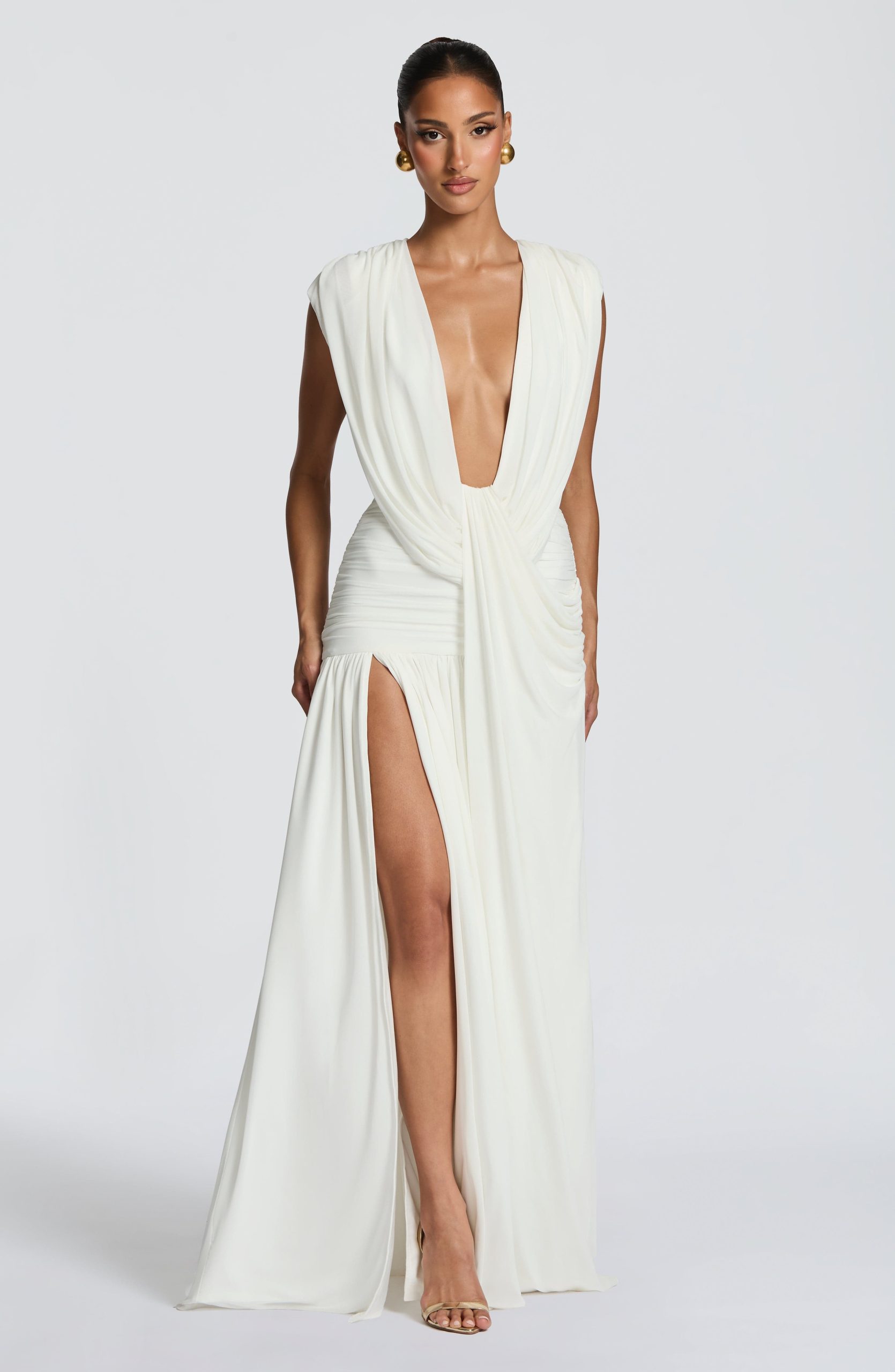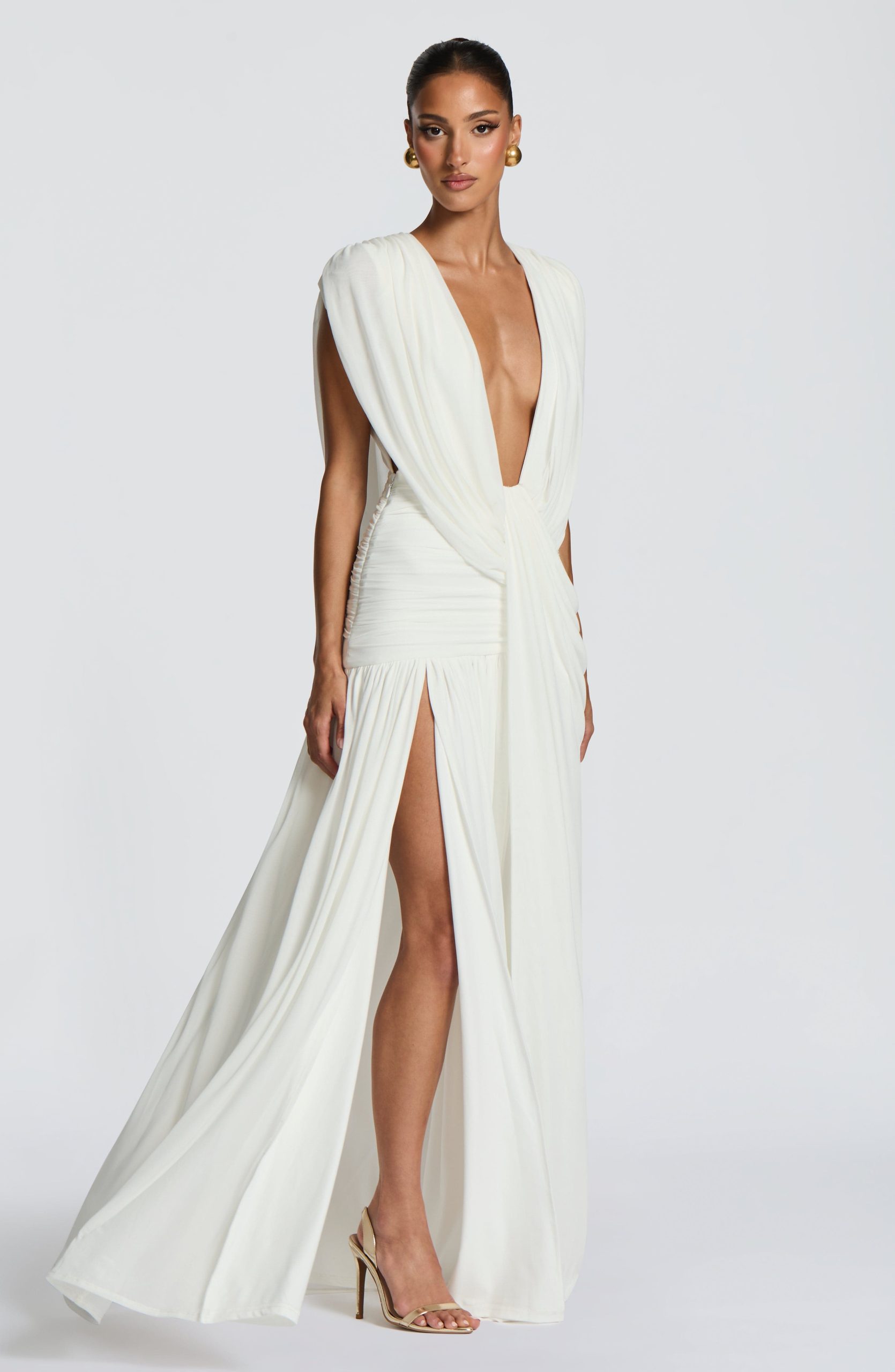The Romilly Gown in ivory features a deep plunge neckline with gathered cowl detailing. Soft mesh fabric lined in jersey creates a drape, while the low back showcases additional cowl styling. A gathered hip panel adds movement and dimension, complemented by a gathered skirt with a thigh-high split.