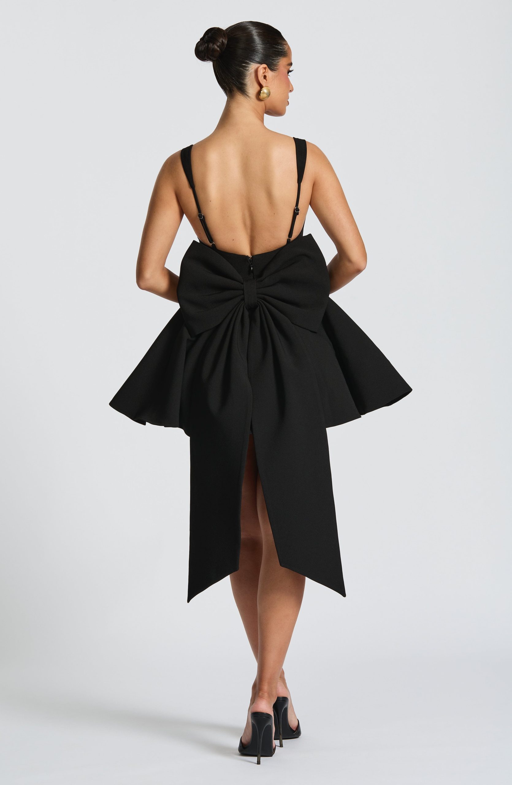 The Rue Mini Dress is perfect for a fun night out. Made with non-stretch crepe, it features a boned bodice and tapered straps for a flattering fit. The detachable bow with long bow tails adds a touch of drama, while the full circular skirt allows for easy movement.