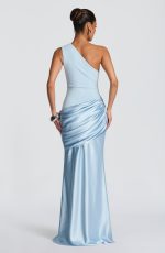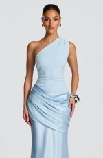 The Sadona Maxi Dress in Glacier Blue delivers refined elegance through contrasting textures and asymmetric design. A structured stretch crepe bodice with one-shoulder neckline meets a flowing satin skirt, anchored by pleated detailing at the waist and hips.