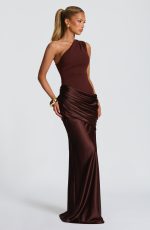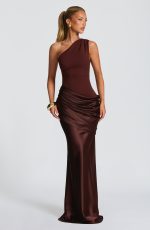The Sadona Maxi Dress in Plum Brown features a structured stretch crepe bodice with an elegant one-shoulder neckline and asymmetric pleating at the waist. The contrast satin skirt flows from a dropped waist with a graceful draped panel across the hips. Maxi length for timeless sophistication.