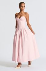 Introducing the Salma Midi Dress in Blush. Crafted from stretch bengaline with a fully lined, strapless neckline and pleated, underwired cups for a truly supportive fit. Designed with a dropped waist, shaped waist seam, and full skirt with pleats for a flattering silhouette. Complete with an open, lace-up back and invisible zipper closure. Elevate your wardrobe with this luxurious and exclusive piece.