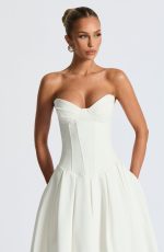 Introducing the Salma Midi Dress – Ivory, crafted from stretch bengaline for a comfortable fit. The fully lined strapless neckline boasts pleated, underwired cups with boning on the bodice for a structured silhouette. The dropped waist and shaped waist seam create a flattering shape, while the open, lace up back adds a touch of elegance. Completed with a full skirt, featuring pleats around the waist, and an invisible zipper closure for a seamless finish.