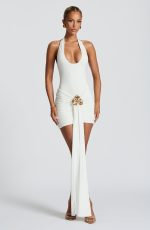 Elevate your ensemble with the Sanne Mini Skirt in pristine white. This sophisticated bodycon piece features elegant ruching throughout and a flattering mid-rise, V-shaped waist. The distinctive front panel and removable orchid brooch offer versatile outfit options. Style with the Odele bodysuit.