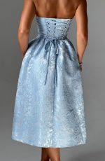 A dress to wear all seasons, Saoirse is cut from our prettiest floral jacquard fabric in a midi length with super full skirt lined with tulle for extra volume. This strapless style has boning in the bodice for a cinched waist, with pleating and gathered detailing. The look is complete with lace up back. Wear with a pointed heel and chic hair up.