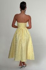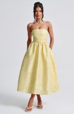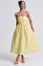 A dress to wear all seasons, Saoirse in Ivory is cut from our prettiest floral jacquard fabric in a midi length with super full skirt lined with tulle for extra volume. This strapless style has boning in the bodice for a cinched waist, with pleating and gathered detailing. The look is complete with lace up back. Wear with a pointed heel and chic hair up.