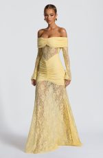 The lemon Sauline Maxi Dress combines stretch jersey and floral lace for a sleek, body-hugging fit. Sheer lace details and ruched hips enhance its elegant silhouette, finished with long sleeves and flared cuffs.