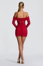 The Sauline Mini Dress in black features a sophisticated blend of slinky jersey and delicate floral lace. With a bardot neckline, sheer lace sleeves, and a ruched, body-hugging silhouette, it offers elegance and allure. Partially lined with flared cuffs.