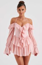 Fall in love with the Savanna playsuit, our super feminine, frilly design with off the shoulder styling and a thin halterneck tie. With a plunge neckline and long, floaty sleeves, the skirts features tiers of ruffles that sway when you move. Wear yours with pretty mule heels and a mini bag.