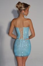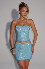 The Serena Top in Aqua features a strapless neckline and a mid-length cut, crafted from stretch net fabric for a comfortable fit. Embellished with square hotfix rhinestones and finished with a lace-up back with satin ties, it offers an elegant and refined silhouette.