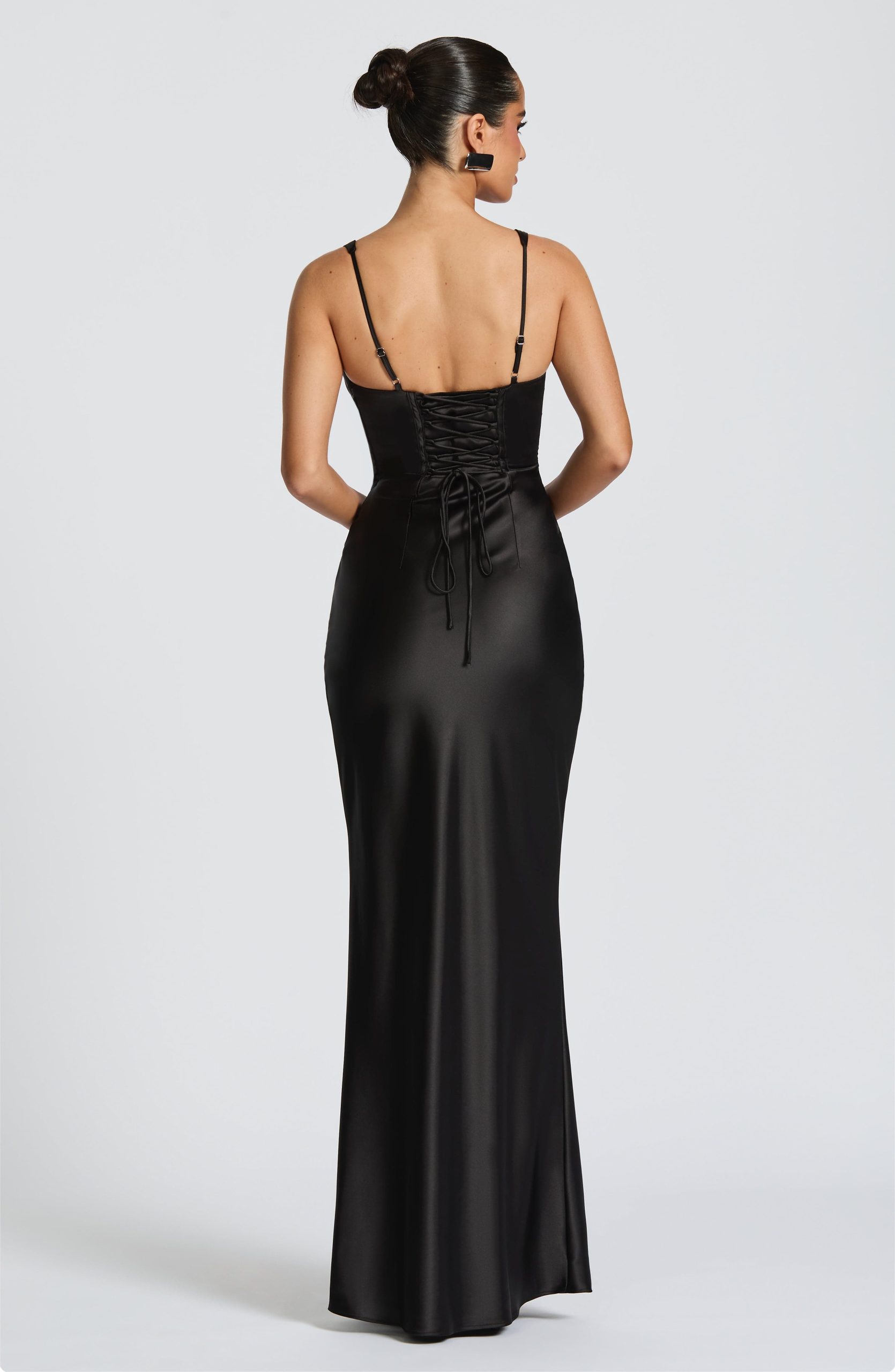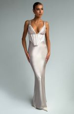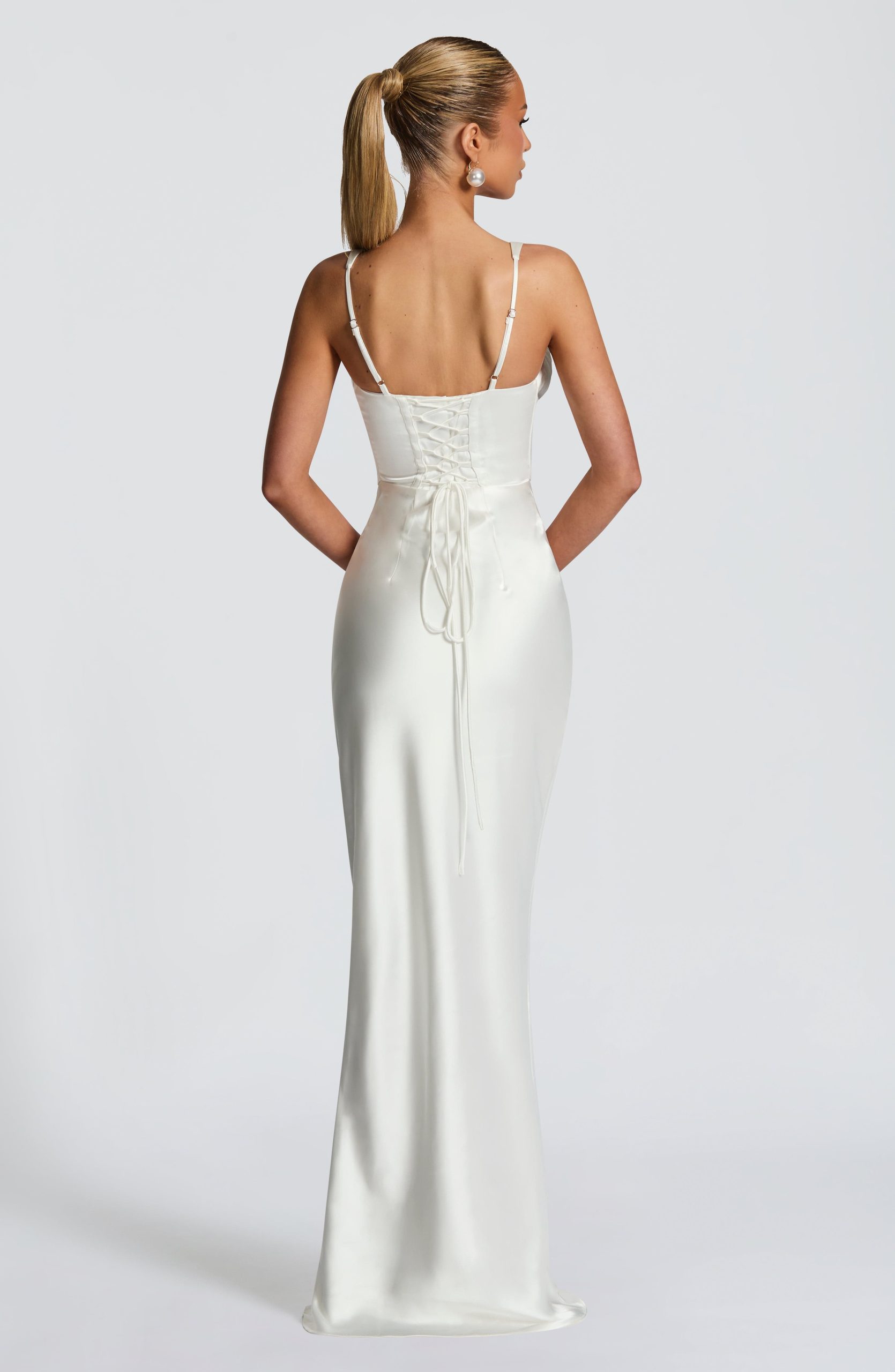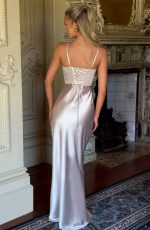 The Shae Maxi Dress in Shell is the epitome of timeless elegance. Crafted from luxurious non-stretch satin, this dress features pleated cups and fan-shaped adjustable straps for a flattering fit. The boned corset overlay enhances the structured silhouette while the lace-up back allows for a customisable, snatched fit.