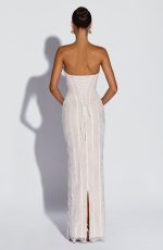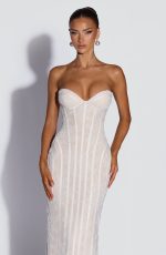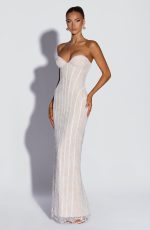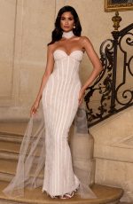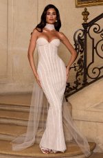 Ivory satin contour binding shapes the silhouette, while a strapless sweetheart neckline with lightly padded underwired cups and a lace-up back cinch and define. A scalloped eyelash hem and centre back split bring the look to a close – refined, luminous, and made for the aisle.