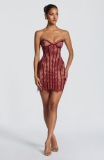 The Sian Mini Dress in burgundy combines timeless elegance with modern edge. Crafted from delicate floral lace with contrast lining and satin binding, this strapless design features lightly padded, underwired cups for a sculpted silhouette. The shaped lace-up back adds intrigue, while the bodycon mini skirt is finished with an eyelash lace hem for refined detail.