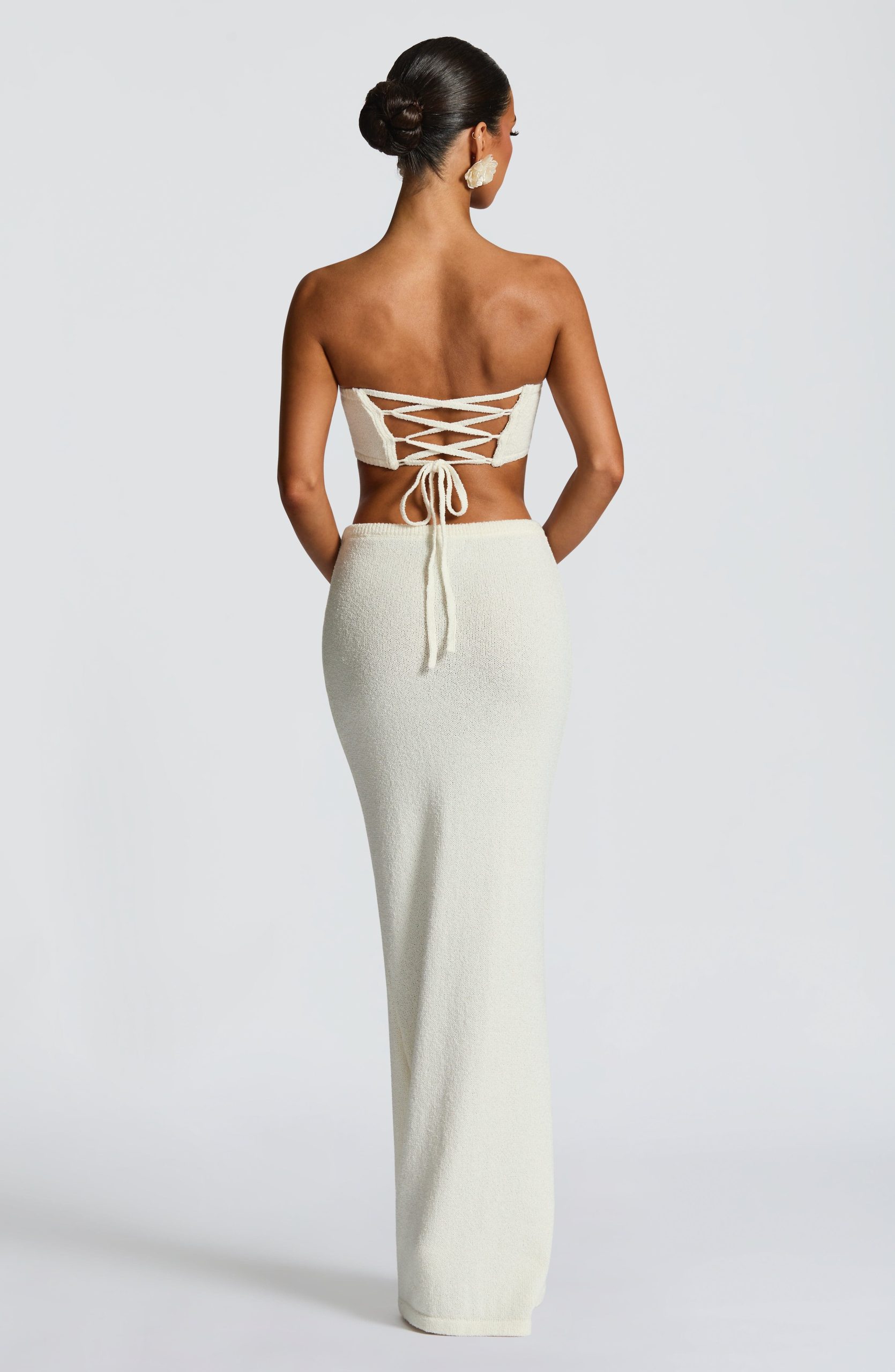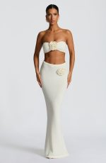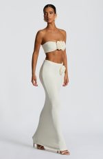 The Sola Maxi Skirt in ivory features a soft knitted yarn with a flattering mid-rise and body-hugging fit. Its maxi length and elegant knitted flower detail at the waist add a refined, sophisticated touch to your wardrobe.