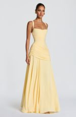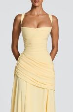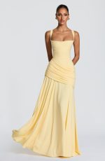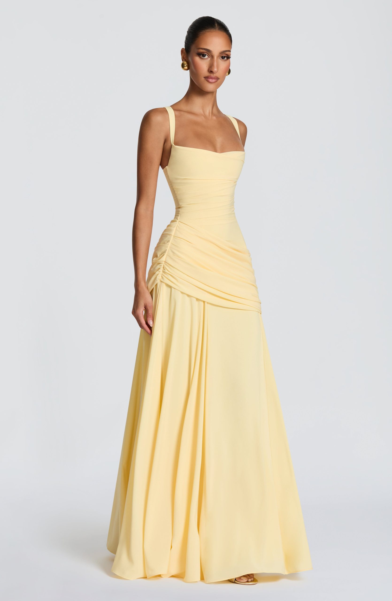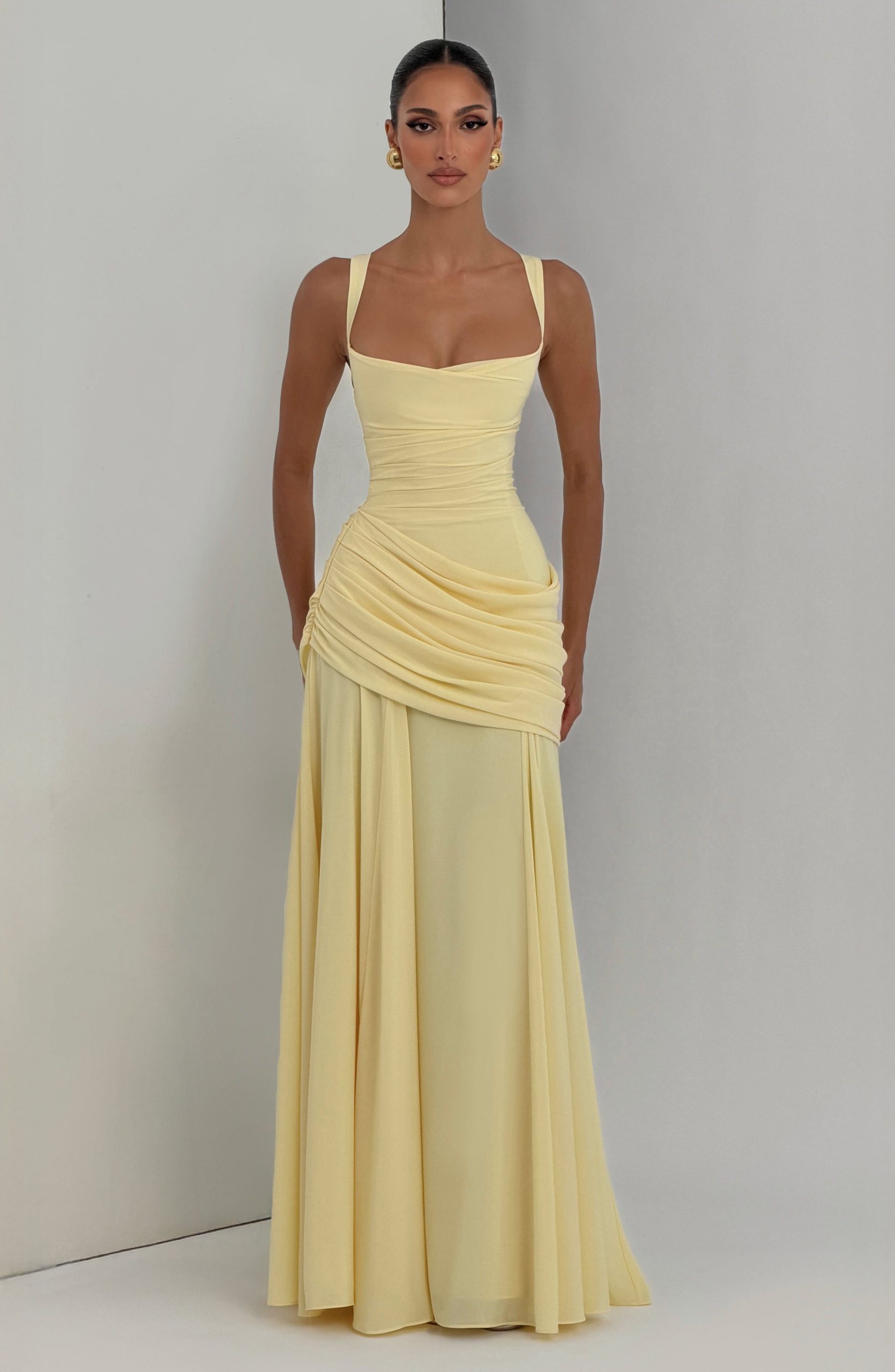 The Sura Maxi Dress in lemon chiffon features a striking twist cowl neckline and tapered shoulder straps that cross at the back. Asymmetric pleating adorns the bodice, while a pleated drape panel skims the hips. The full skirt flows with godets, finished with a lace-up, cinched silhouette.