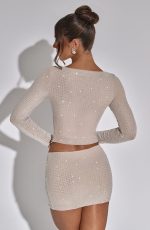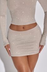 Nude never looked so fabulous! This mini skirt, made with rhinestone stretch mesh fabric, perfectly hugs your figure in all the right places. Match with the Zaya top, Ginni Scarf and heels for party season.