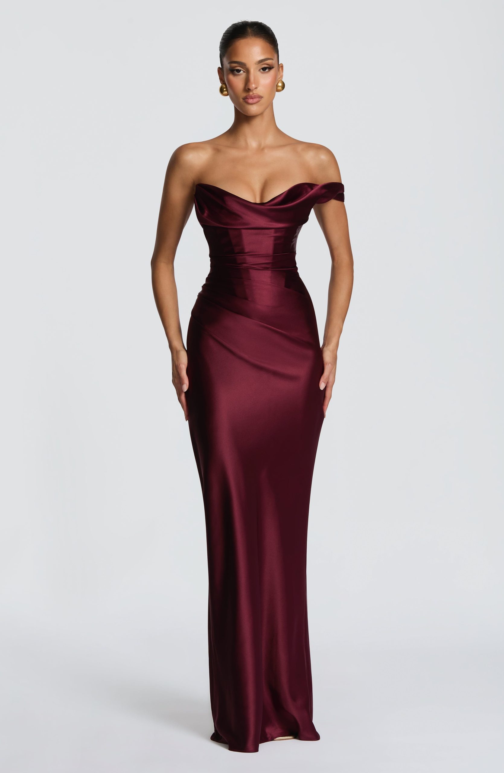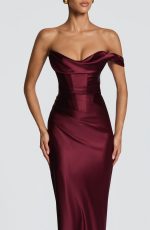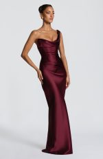 The Thalassa Maxi Dress in Cherry Lacquer features an elegant one-shoulder scooped neckline with pleated cowl detail and asymmetric pleating across the bodice, this dress commands attention. The bias-cut skirt flows to maxi length, while an internal corset bodice and lace-up back create a refined, cinched silhouette.