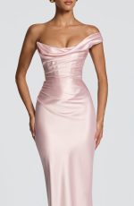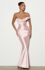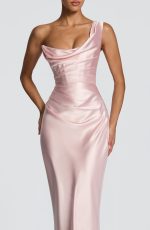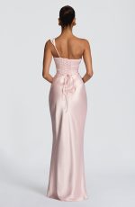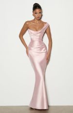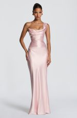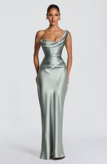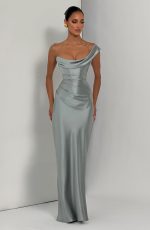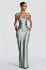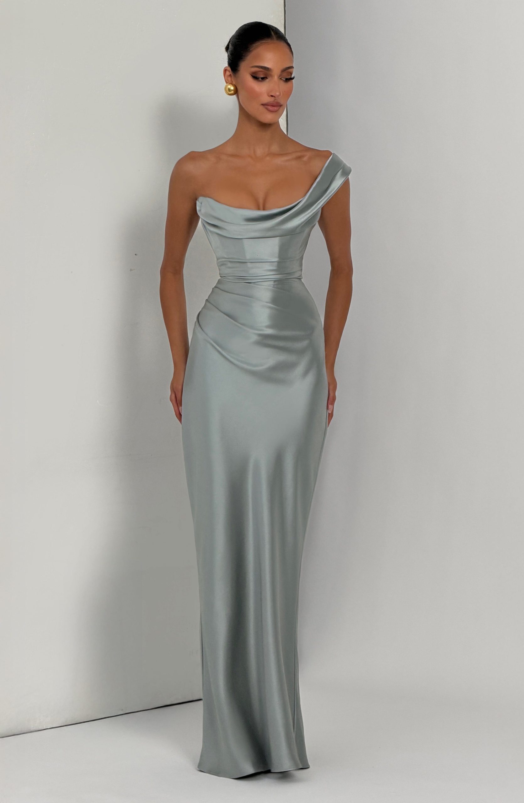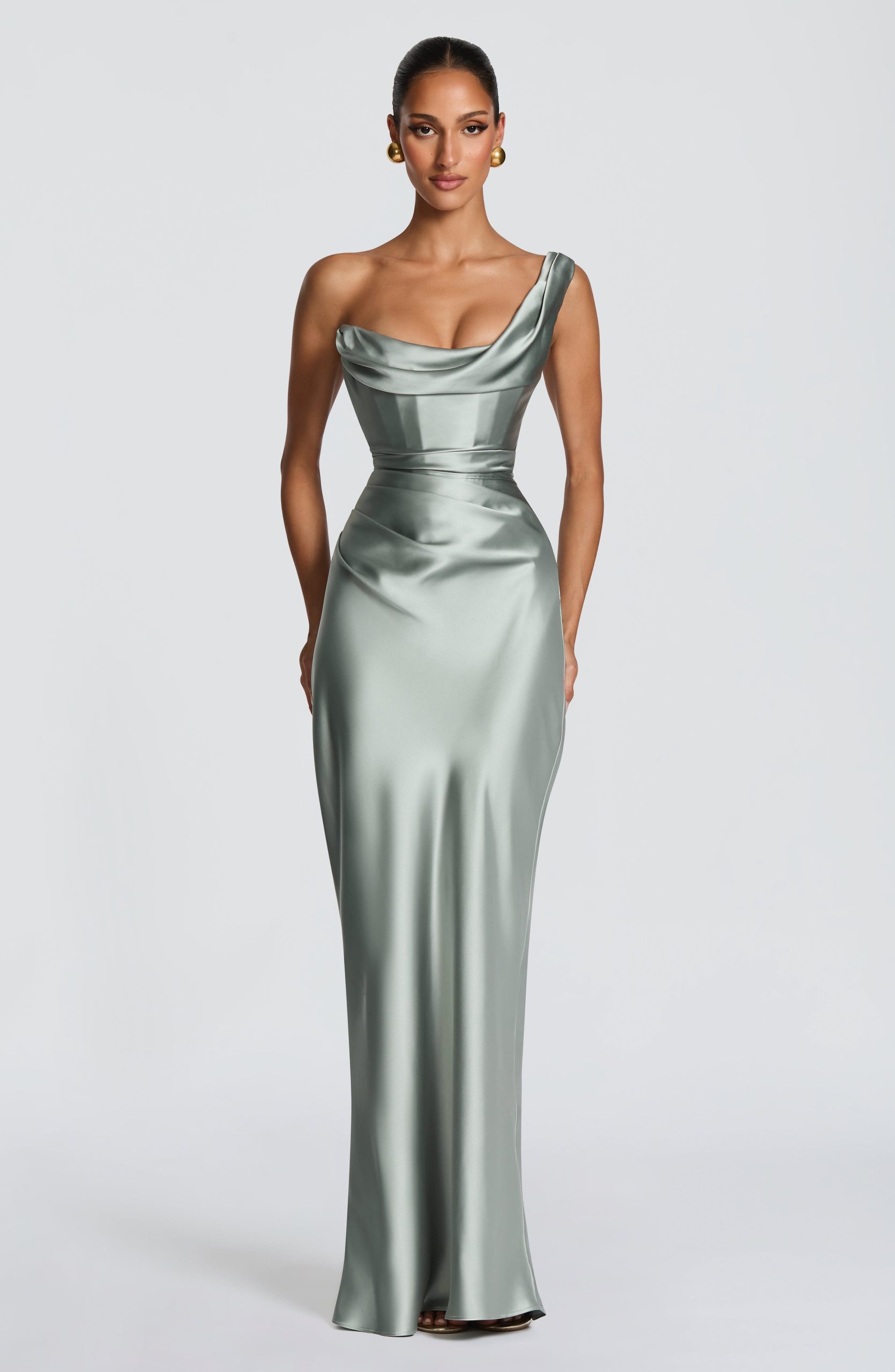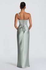 The Thalassa Maxi Dress in sage features a non-stretch satin construction with a one-shoulder scooped neckline and pleated cowl detail. The asymmetric pleating on the bodice pairs with an internal corset and lace-up back for a cinched, sculpted silhouette. A bias-cut skirt flows to maxi length.