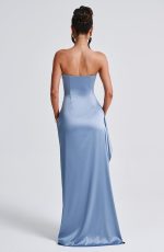Feel ethereal in Tian, our dusty blue maxi dress of dreams. Cut from our signature luxe stretch satin that hugs the body, this strapless design is effortlessly stunning, with internal boning for a snatched look and sexy thigh high split. Keep things simple with sleek hair, blue heels and bag.