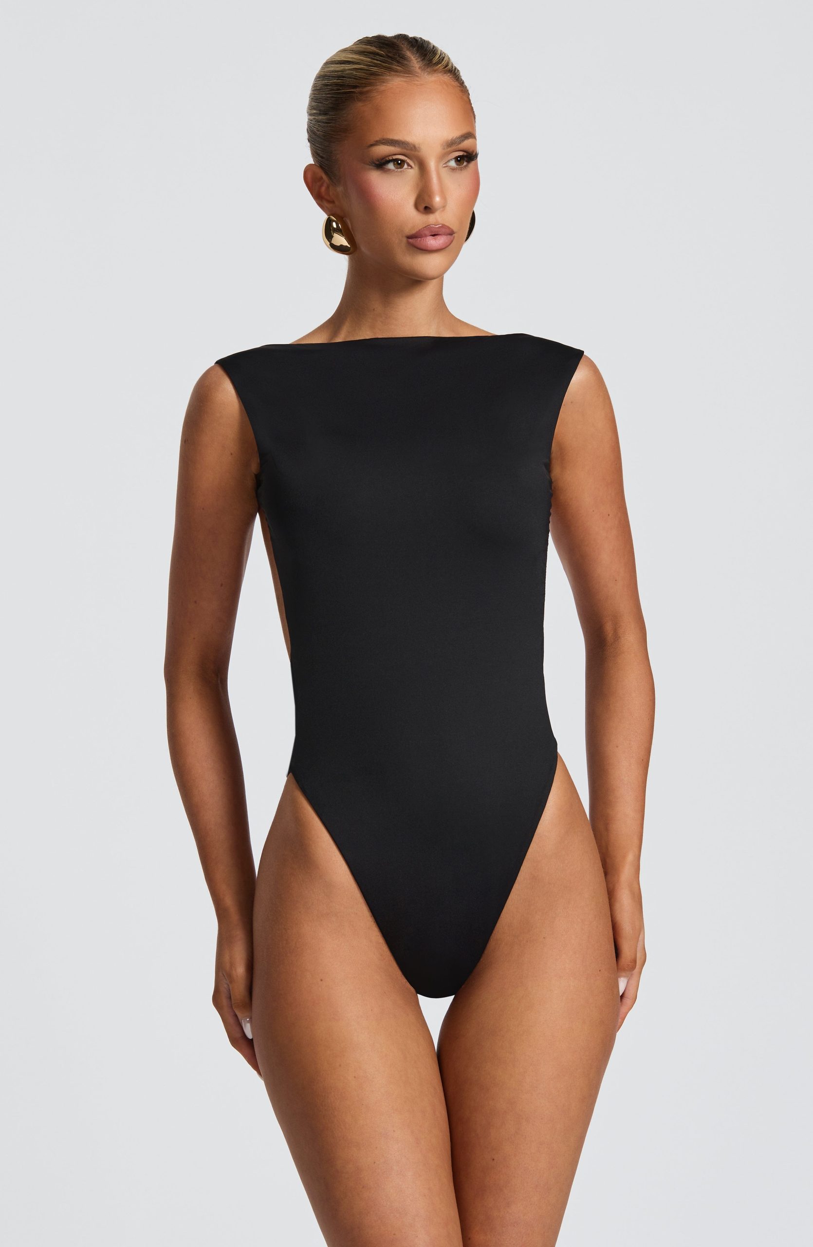 The Tori Bodysuit in light grey features a sleek, bodycon fit crafted from slinky jersey for elegant comfort. It offers a high, wide neckline and a low scooped back, complemented by non-adjustable self-fabric straps. An adjustable press stud closure at the crotch ensures a seamless, refined silhouette.