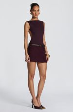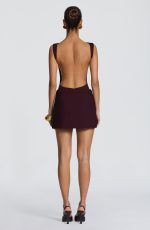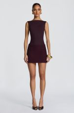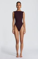 The Tori Bodysuit in Plum features a sleek slinky jersey fabric with a flattering bodycon fit. Its high, wide neckline and low scooped back create an elegant silhouette, complemented by non-adjustable self-fabric straps. Designed for comfort and ease, it includes an adjustable press stud closure at the crotch.