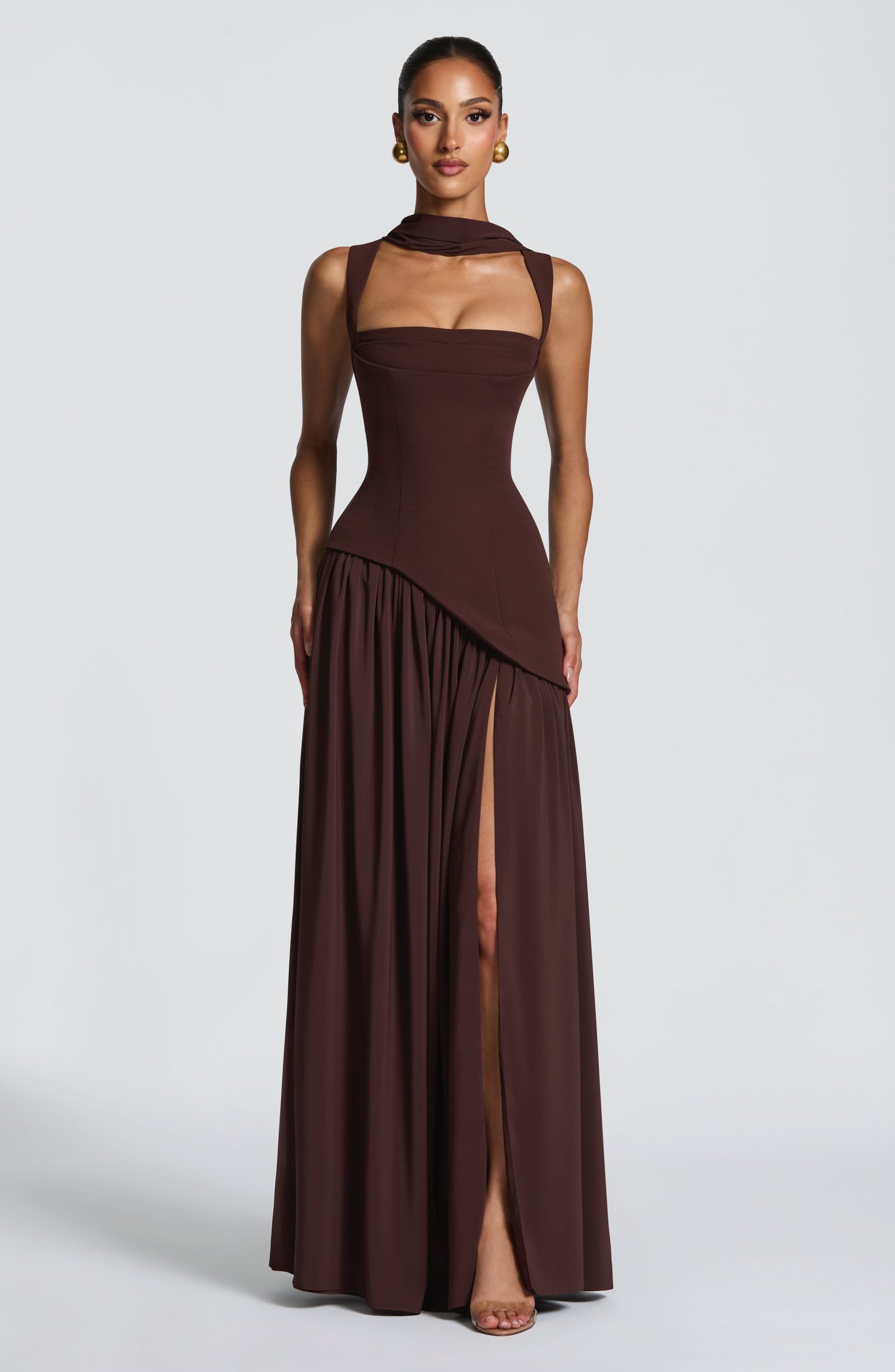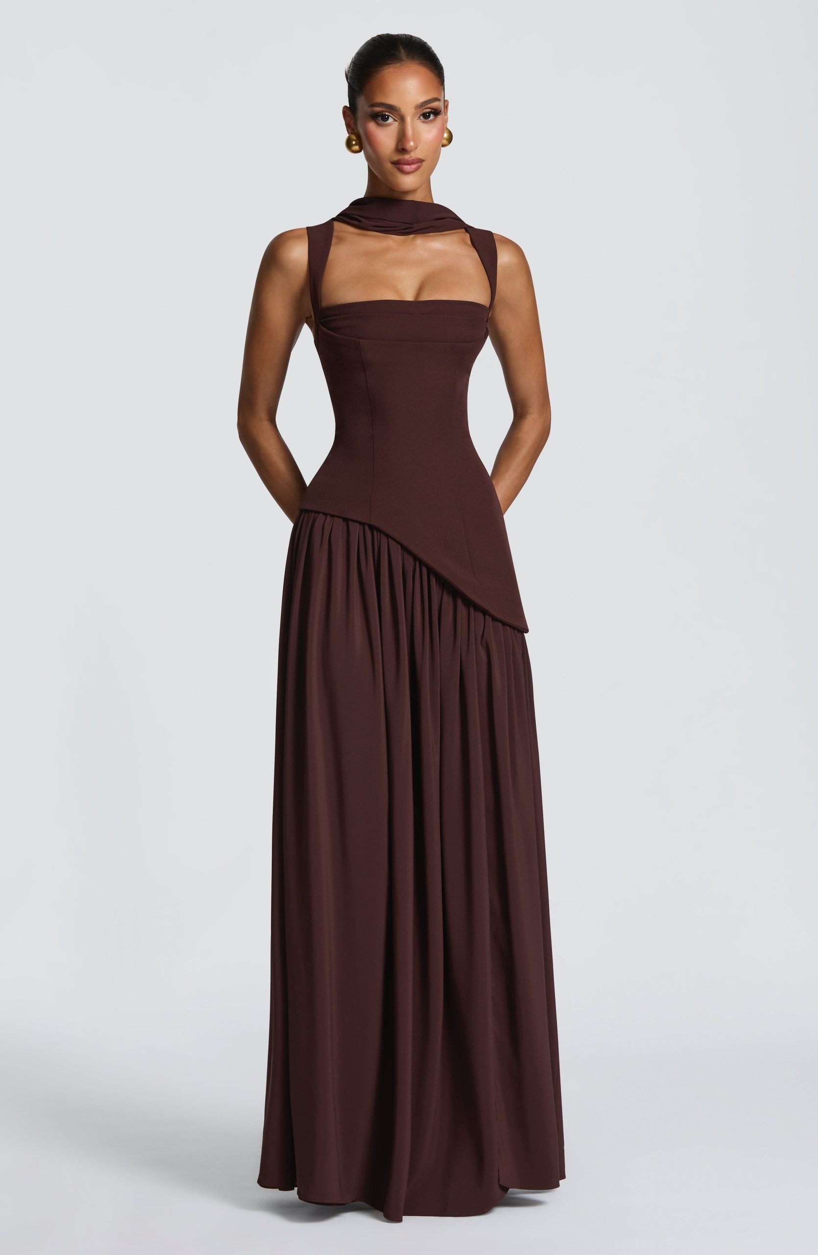 The Tullulah Maxi Dress in Plum Brown combines structured elegance. A non-stretch crepe bodice features a square neckline with pleated bust detail, princess seams, and a lace-up back, while the chiffon skirt flows into a full, gathered silhouette with a thigh-high split. Tapered shoulder straps and an asymmetric curved hem complete this piece.
