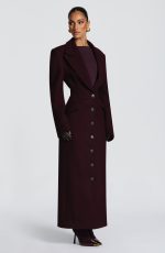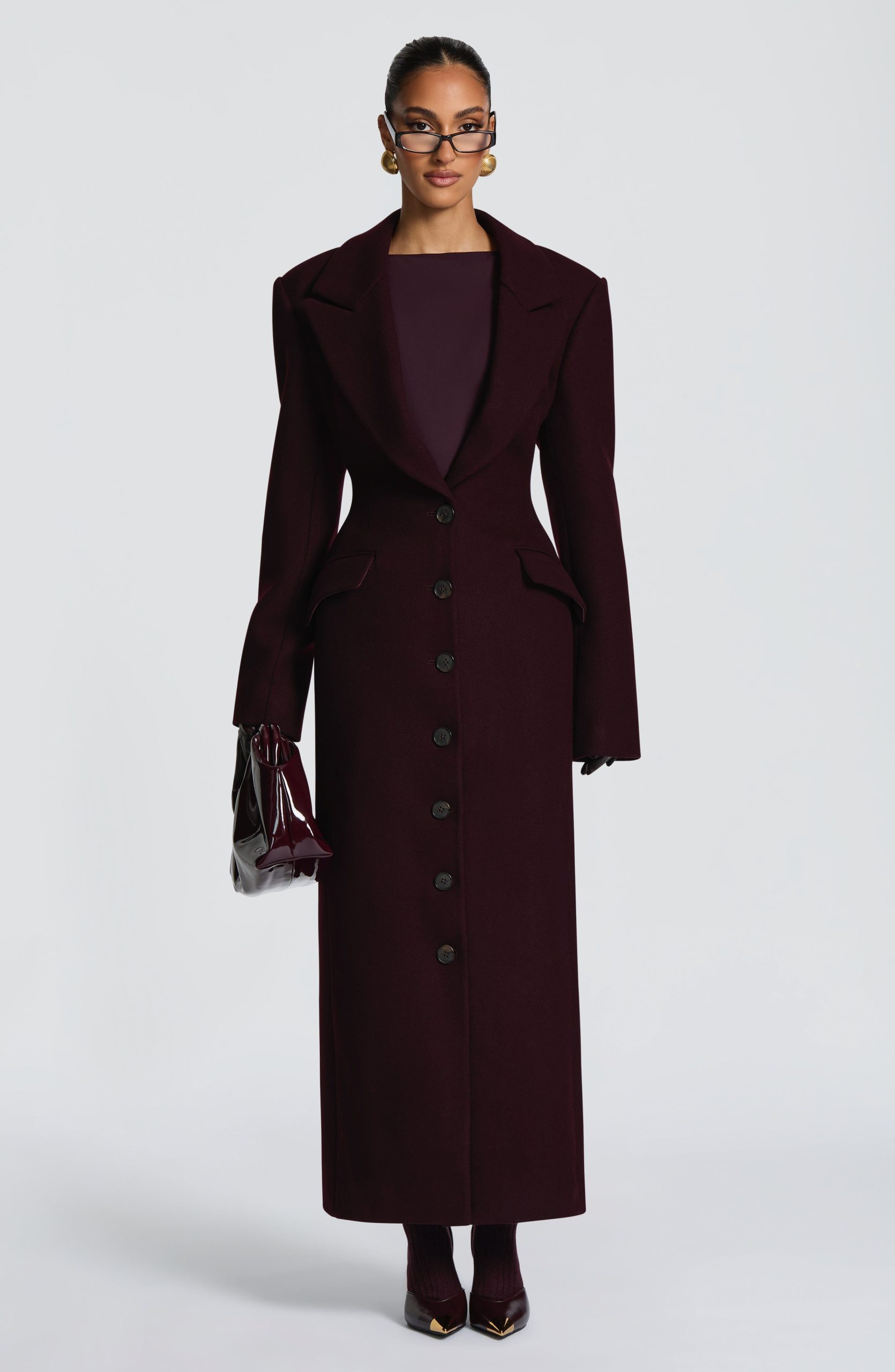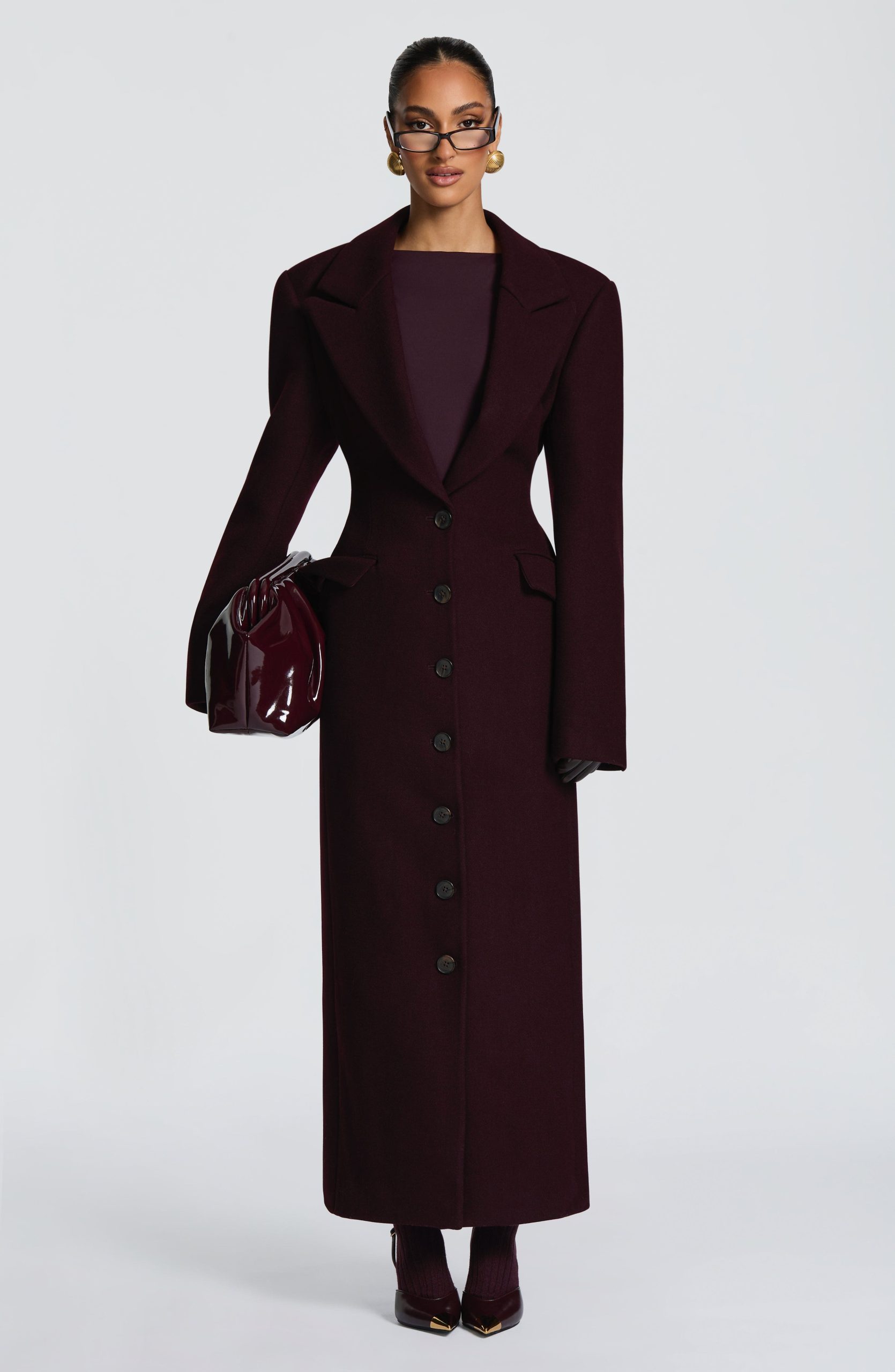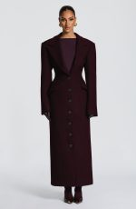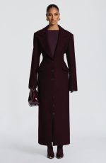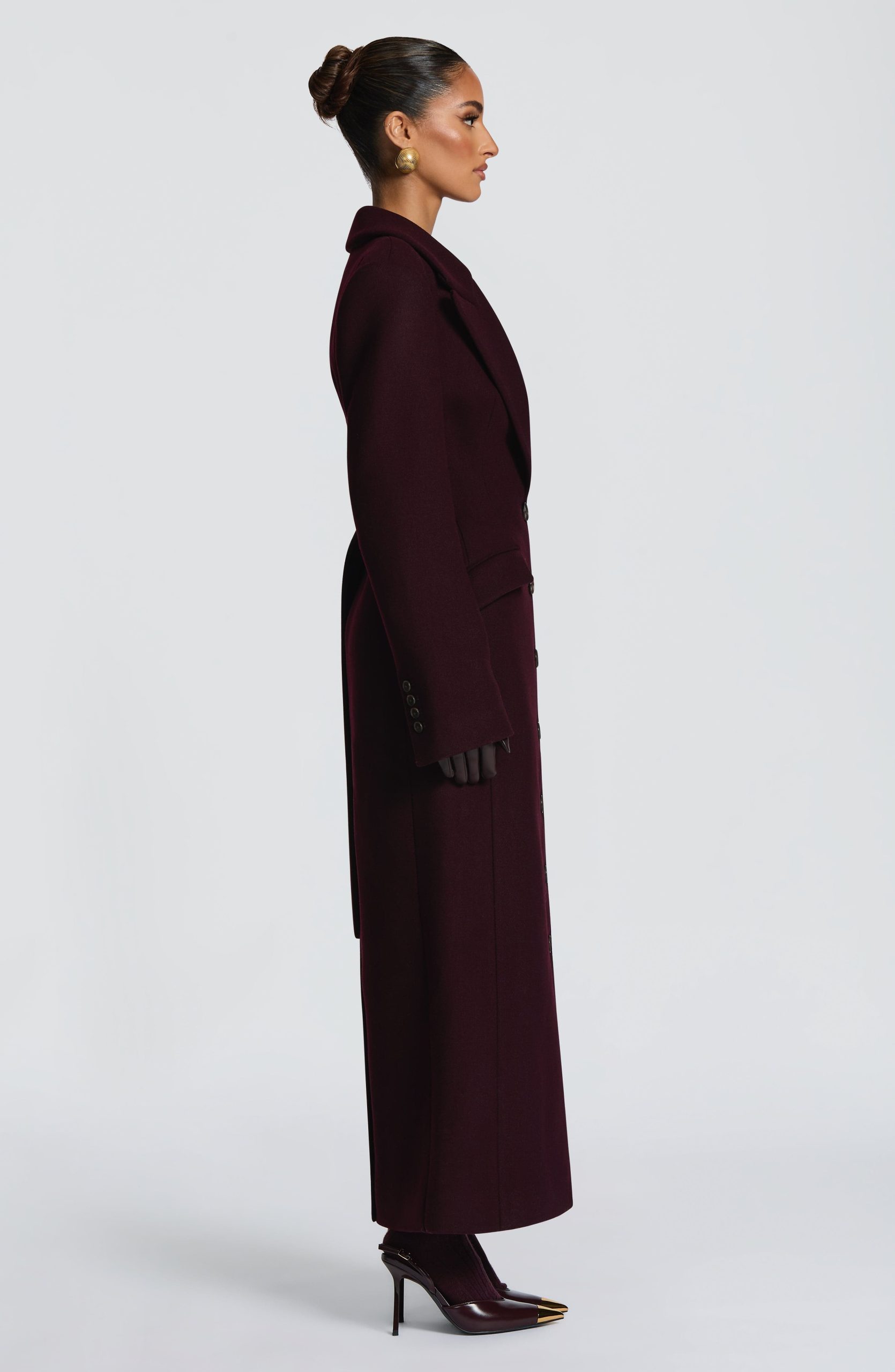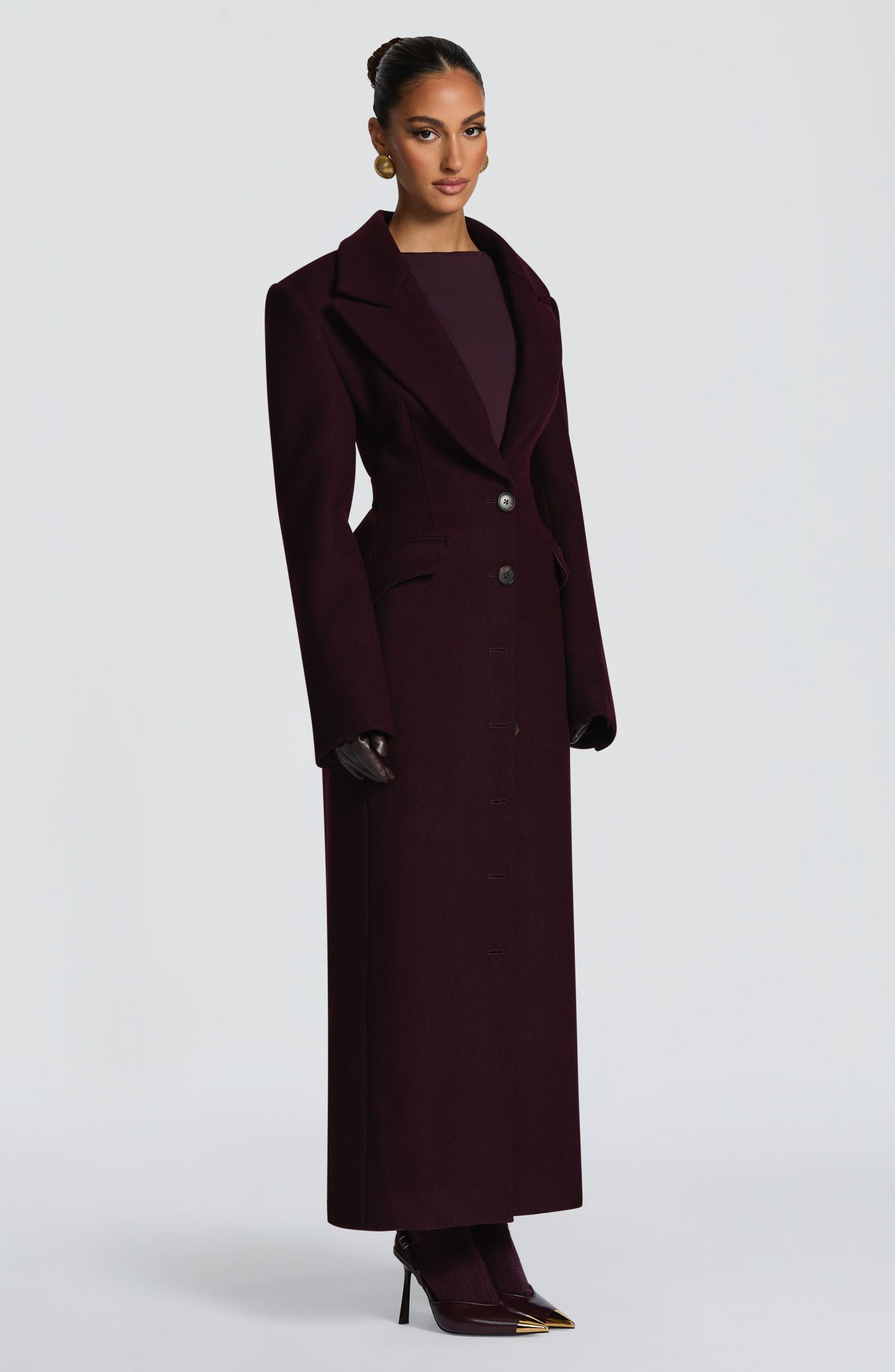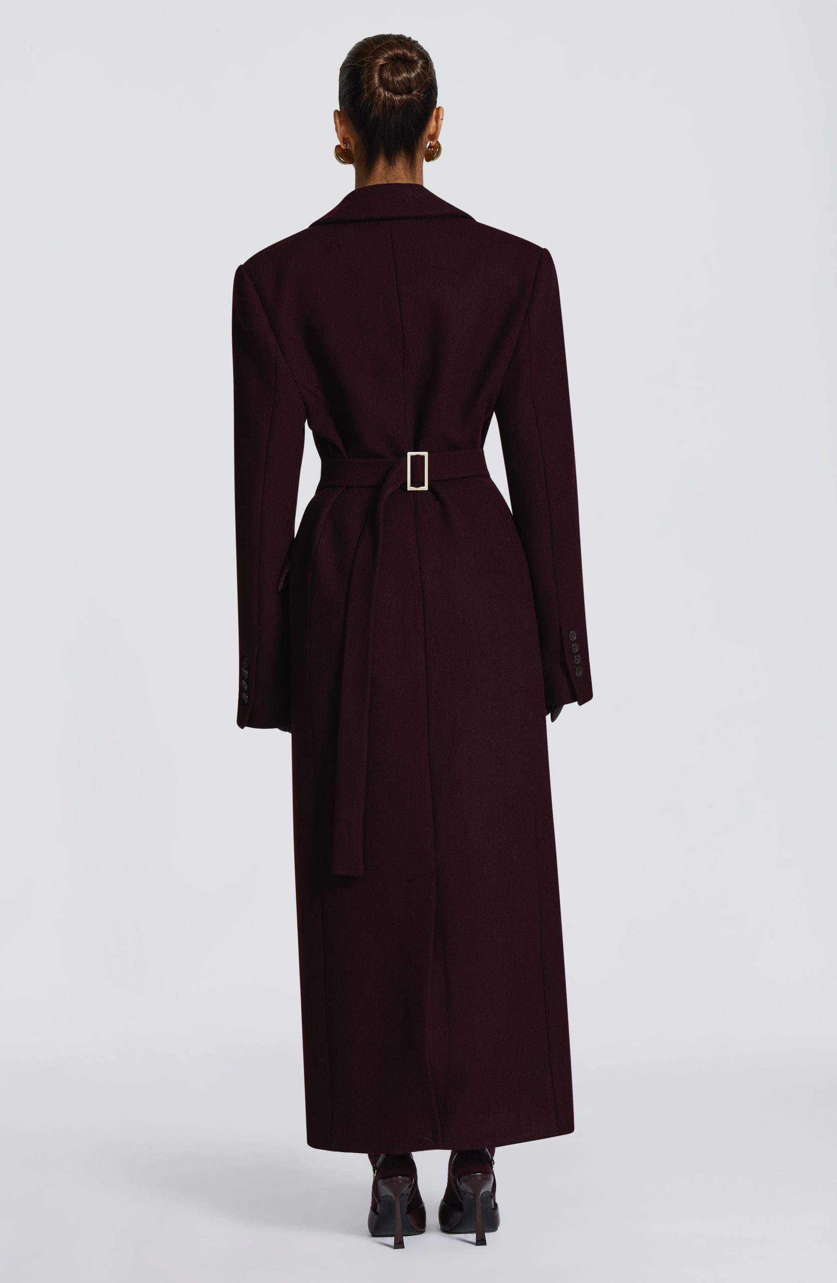 The Ursula Coat in plum offers a refined silhouette with its full-length, tailored wool blend design. Featuring a notched collar with wide lapels and an adjustable waist strap at the back, it ensures a sleek, personalized fit. Multi-button closure and angled welt pockets add detail to this timeless piece.