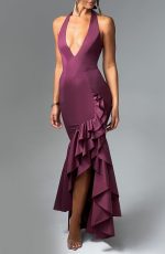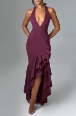 The Veronique Maxi Dress in Black with White Contrast Hem is a show-stopping piece. Featuring a plunging halter neckline that ties elegantly at the back of the neck, this dress exudes allure while providing structure with boning in the bodice for a flattering fit. The maxi length is elevated by cascading voluminous frills at the hem.